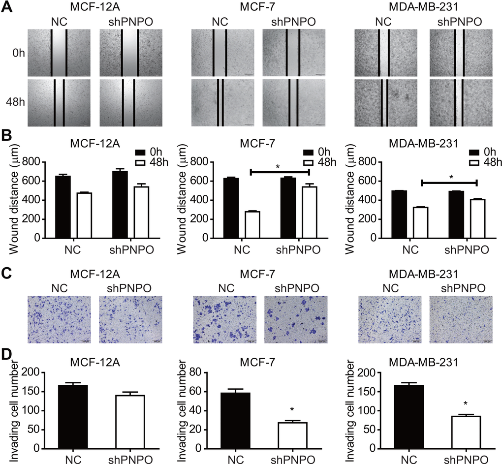 The effect of PNPO knockdown on cell migration and invasion was evaluated by the wound-healing and Transwell assays, respectively. The growth gap was assessed by measuring the wound distance (Figure 6A). The wound-healing was significantly slower in MCF-7 and MDA-MB-231 cells after PNPO knockdown (Figure 6B). In a Transwell assay, a reduced number of invading cells was observed in MCF-7 and MDA-MB-231 cells after PNPO knockdown for 48 h (Figure 6C and 6D).