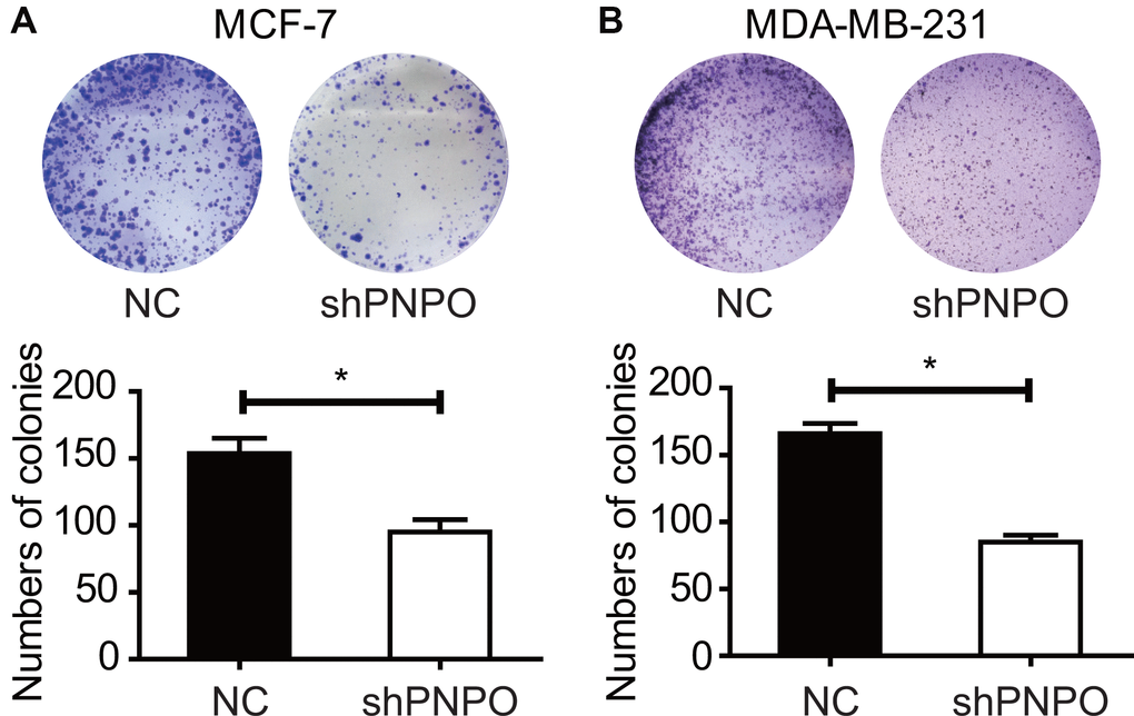 Knockdown of PNPO affected colony formation. The number of colonies was reduced after PNPO-shRNA infection in MCF-7 (Figure 7A) and MDA-MB-231 (Figure 7B) cells.