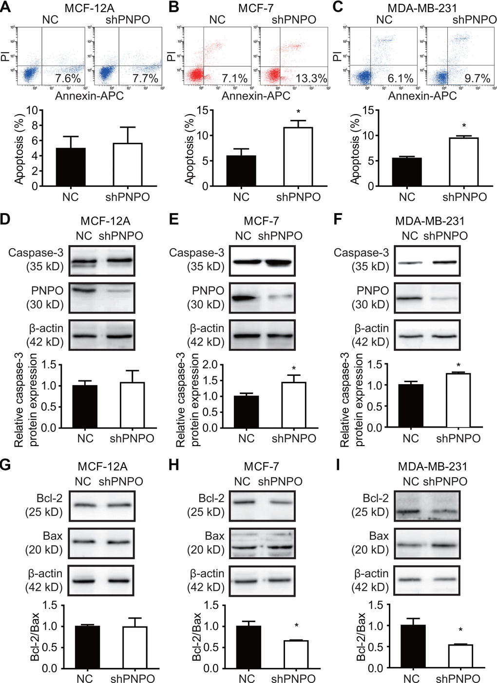 Flow cytometry showed that the number of early apoptotic cells was increased in MCF-7 and MDA-MB-231 cells, not in MCF-12A cells, after PNPO knockdown compared with NC cells (Figure 8A–8C). After PNPO knockdown was confirmed, an increased caspase-3 was detected only in MCF-7 and MDA-MB-231 cells, not in MCF-12A cells (Figure 8D–8F). Further, a decreased ratio of anti-apoptotic factor Bcl-2 over pro-apoptotic factor Bax was found in MCF-7 and MDA-MB-231 cells, not in MCF-12A cells, after PNPO knockdown compared with NC cells (Figure 8G–8I).