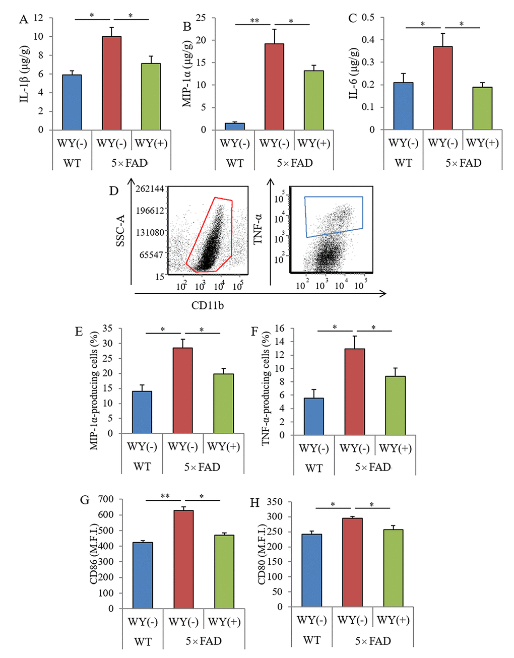 The levels of IL-1β, MIP-1α, and IL-6 in the hippocampi of the 5×FAD mice were significantly higher than those of the wild-type mice. The levels of these cytokines in 5×FAD mice fed the WY-containing diet were significantly lower than those in 5×FAD control mice fed the control diet (Figures 5A–C, respectively). In addition, CD11b-positive microglia in the brain were isolated, and cytokine production and the expressions of stimulatory molecules were measured by flow cytometry (Figure 5D). The percentages of MIP-1α and TNF-α-producing CD11b-positive microglia and the expressions of CD86 and CD80 on the microglia were significantly increased in the brains of 5×FAD mice compared with those of wild-type mice. The percentages and expressions of these cytokines were significantly decreased in 5×FAD mice fed a WY peptide-containing diet compared with those in 5×FAD control mice (Figure 6E–H, respectively). These results show that the WY peptide suppresses inflammation and activation of the microglia in the brains of 5×FAD mice.