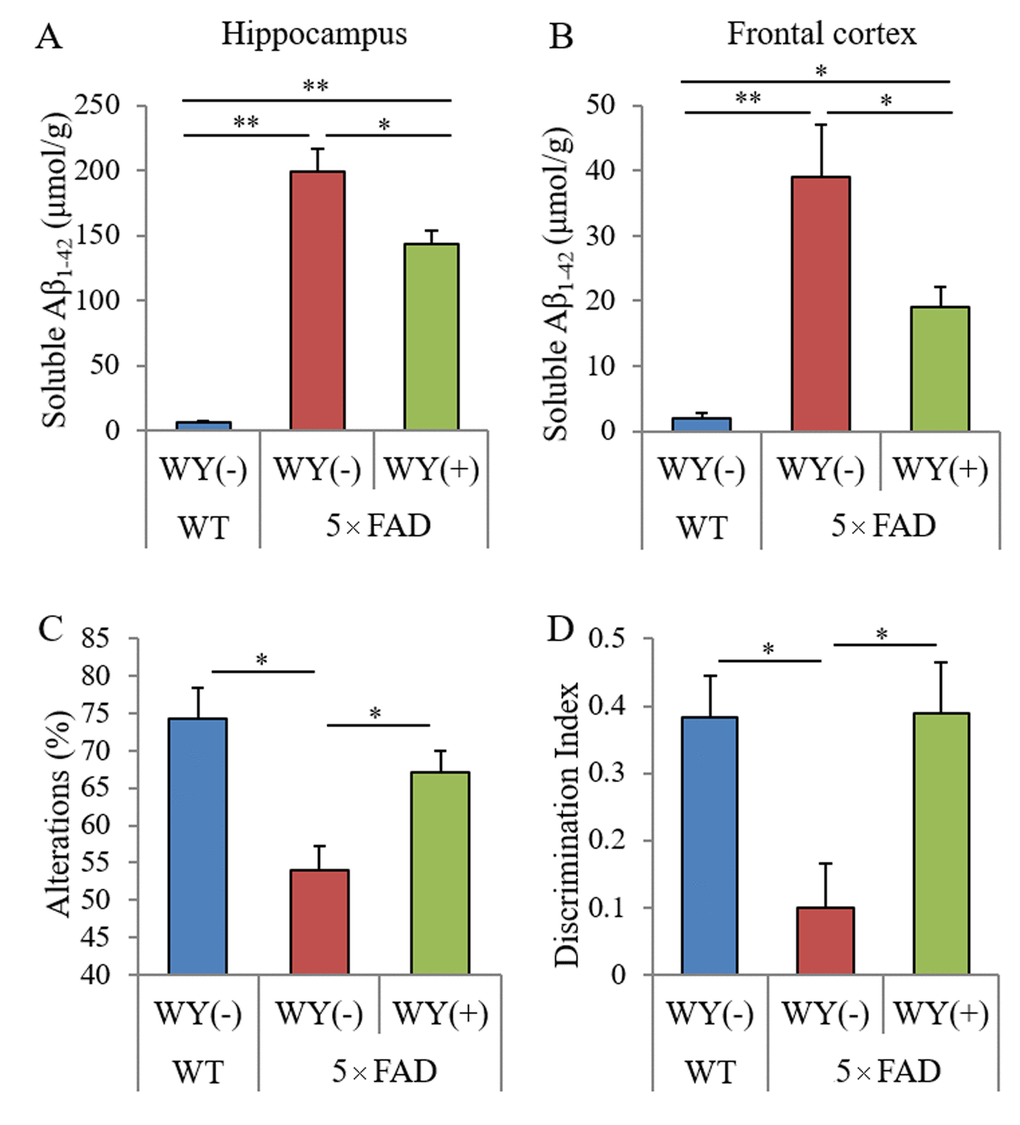Last, to investigate the effects of the WY peptide on memory impairment, 5×FAD mice administered the WY peptide were subjected to the Y-maze test and NORT. The spontaneous alterations of the Y-maze test and discrimination index of the NORT in 5×FAD mice were decreased compared with those in wild-type mice. Those alternations were significantly increased in 5×FAD mice fed WY peptide-containing diet compared with those in 5×FAD control mice (Figure 6C and D, respectively). These results indicate that intake of the WY peptide prevents memory impairment in 5×FAD mice.