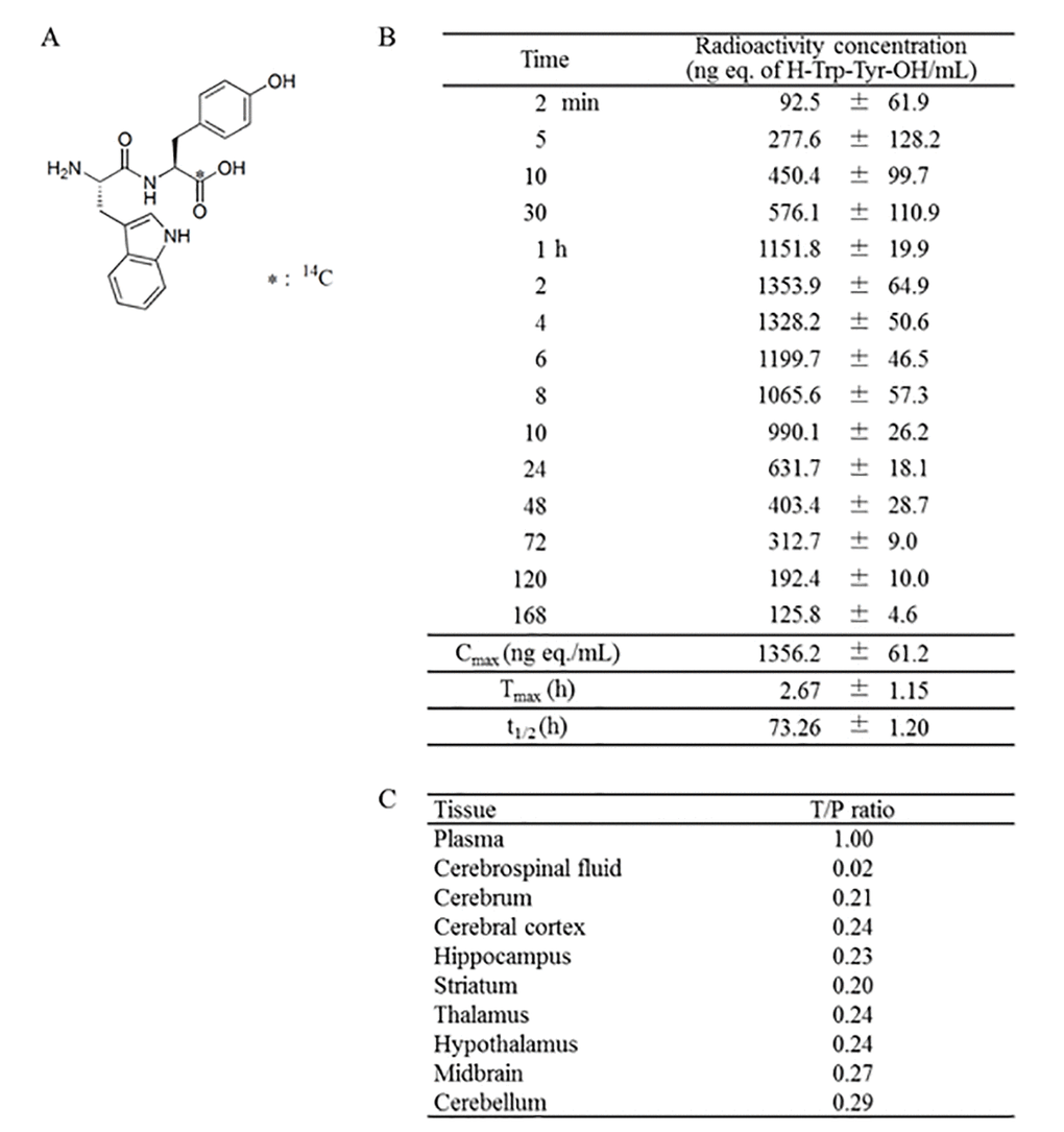 14C-labeled WY, Trp-[carboxyl-14C]Tyr (14C-WY), was prepared by Sekisui Medical Ltd. The radiochemical purity assessed by HPLC was 99.3%, and its specific radioactivity was 5.76 MBq/mg. The test solution 14C-WY (0.1 mg/mL) was dissolved in distilled water and prepared just before its administration. SD rats (n = 3) were starved for 16 h and administered the solution orally (10 mL/kg body weight, 5.76 MBq/kg). At 2, 5, 10, and 30 min and at 1, 2, 4, 6, 8, 10, 24, 48, and 72 h after administration, the radioactivities of the plasma samples were quantified by using a liquid scintillation counter (HIONIC-FLUOR; PerkinElmer, MA, USA) At 2 h after administration, the radioactivity of each organ homogenate was quantified by using the scintillation counter.