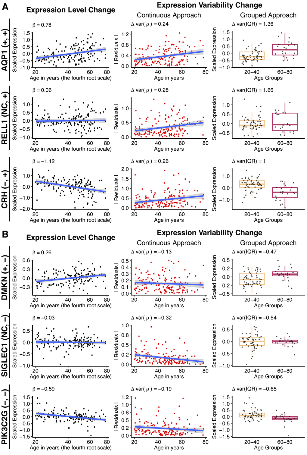 Two different strategies were employed to measure change in the gene expression variability with age, namely continuous and grouped approaches. The continuous approach detects continuous monotonic change in variation from 20 to 80 years of age. The grouped approach compares the gene expression variation between two age groups: young (20 - 40 years old, N = 53) and old (60 - 80 years old, N = 22). Figure 2 illustrates the principles of these approaches and shows that the change in variability can be combined with any dynamics in the mean gene expression (upregulation, downregulation, no change). We checked if the changes in gene expression variability were confounded by the changes in gene expression level, but did not observe any relationship (Supplemental Figure 10, Fisher’s test p = 0.11, Odds ratio = 1.05).