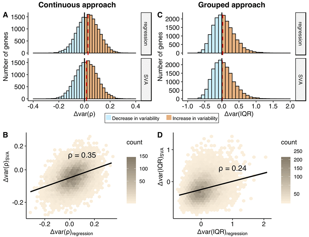 In the continuous approach, we first fit a linear model to explain age-dependent change in expression (Figure 2, first column) and then used the residuals from this model to represent the variability. To measure change in the expression variability with age, we calculated the Spearman correlation coefficient (Δvar(ρ)) between the absolute value of residuals and age (Figure 2, middle column). The Δvar(ρ) measures ranged between -0.32 and 0.36 and were normally distributed (Shapiro-Wilk test, p > 0.05, see Methods) (Figure 3A). The distributions were significantly shifted towards positive values for both correction methods (median values range between 0.01 to 0.03, Wilcoxon test, p < 2.2e-16). Although the shift in the distribution was small, 57% to 63% percent of the genes showed increase in variability with age. However, we noted that the changes in variability calculated for each gene, using regression- and SVA-corrected data, were only weakly correlated, ρ(Δvar(ρregres), Δvar(ρSVA)) = 0.35 (Figure 3B).