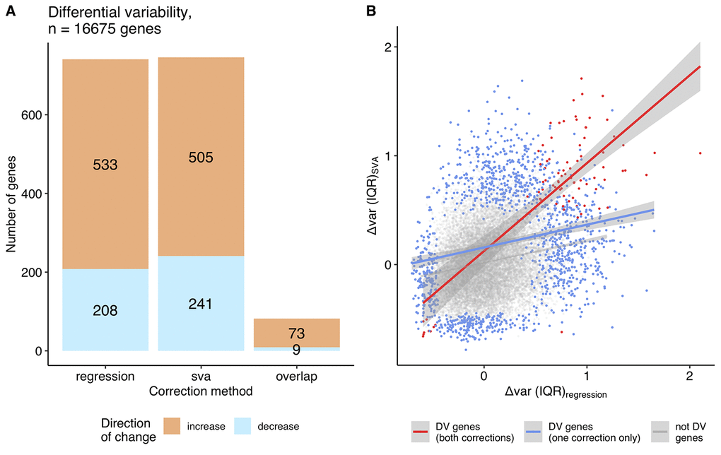 Another technical aspect we considered was the effect of pre-processing steps. While applying regression and SVA corrections, we showed that significantly DV genes hardly overlap between the corrections, with only 6% being in common (Jaccard similarity) (Figure 4A). Unfortunately, current approaches for handling transcriptome data are designed only to remove the confounding factors on the expression level and not on the expression variability. Thus, SVA and regression demonstrated much higher agreement in the differentially expressed (DE) genes (24% in common, Jaccard similarity) (Figure 1B). That raises a question: which set includes the genuine DV genes? The different correction strategies are quite distinct and might be accounting for different aspects, which is evident from the weak correlation between them (Spearman ρ between regression and SVA-corrected data for continuous approach – 0.35, grouped approach - 0.24, Supplemental Figure 6-7). In this case, the union may capture the full aspects of differential variability, whereas the overlap can provide the gene list in which we are most confident.