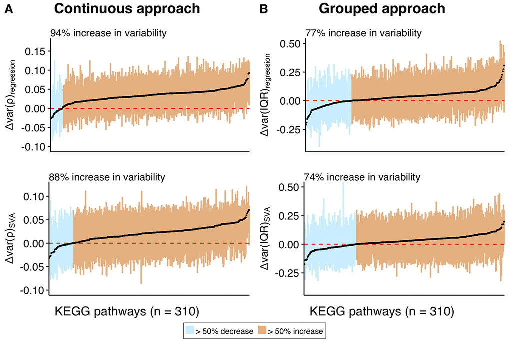 KEGG pathway to gene mapping was obtained from “KEGGREST” R library and pathways were pre-filtered to contain between 5 and 500 genes. As a result, 310 KEGG pathways that comprise 5922 unique genes were used for the subsequent analysis. The boxplots illustrated distributions of the Δvar measure for genes in each pathway. Pathways were sorted according to their median Δvar measure in ascending order. The percentage of pathways that have their median Δvar above zero was calculated. The analysis was replicated using BP GO terms (N = 5919) of a size between 10 and 500 genes, which in total contained 12538 unique genes. Mapping of GO terms to genes was obtained from “org.Hs.eg.db” R library.