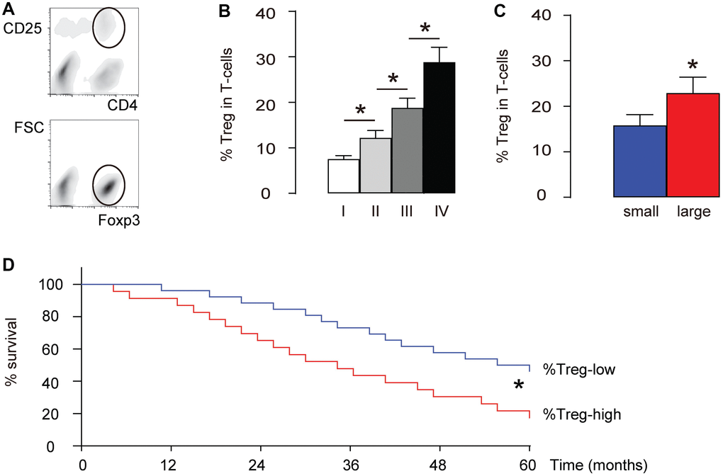 We examined intratumoral Treg cells (CD4+CD25+Foxp3+) in total T-cells (CD4+) in 40 HCC specimens (Table 1, Figure 1A). We found that the percentage of intratumoral Treg cells significantly increased with the tumor grade (IV>III>II>I, p<0.05, Figure 1B). The median size of these 40 dissected tumors was used as a cutting point to get 20 small-size HCCs and 20 large-size HCCs. We found that the percentage of intratumoral Treg cells in the large-size HCCs was significantly higher than those from the small-size HCCs (p<0.05, Figure 1C). Next, we used the median level of %Treg to separate %Treg-high (n=20) from %Treg-low patients (n=20) and examined their overall five-year survival. We found that the overall survival of %Treg-low patients was significantly better (p<0.05, Figure 1D). Thus, more intratumoral Treg cells are detected in high-grade, or large HCCs and correlate with poor prognosis.