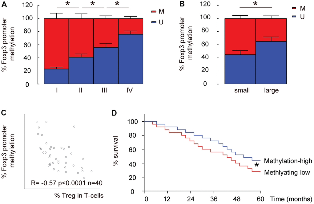 Since the epigenetic control (mainly through methylation) of Foxp3 promoter determines Treg differentiation and stability, we examined the levels of promoter methylation of Foxp3 in intratumoral T-cells in these 40 specimens. We found that the methylation levels of Foxp3 promoter in intratumoral T-cells significantly decreased with the tumor grade (IV