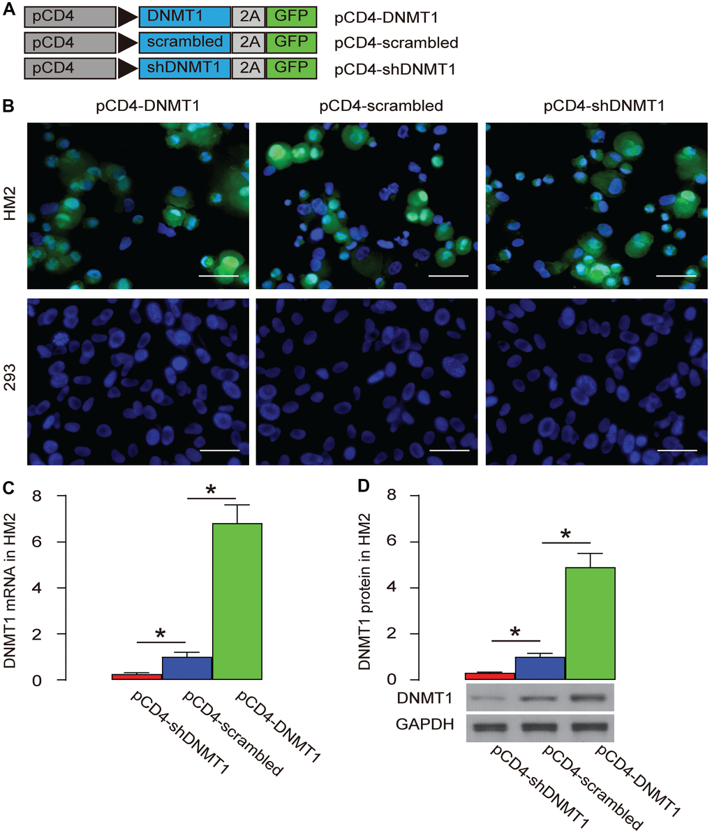 DNA (cytosine-5)-methyltransferase 1 (DNMT1) is a major methylation inducer. We used an adeno-associated virus (AAV) carrying either DNMT1, or scrambled (as a control) or shDNMT1 under a CD4 promoter (AAV-pCD4-DNMT1, AAV-pCD4-scrambled, AAV-pCD4-shDNMT1) to successfully target T-cells and alter the levels of DNMT1 (Figure 3A). These AAVs were used to infect a human T-cell line, HM2 and a human non-T-cell, HEK293. We found that HM2 cells were transduced, while HEK293 cells were not, based on expression of GFP reporter (Figure 3B.). The changes in DNMT1 levels were assessed by RT-qPCR (Figure 3C), and by Western blot (Figure 3D), confirming the effects of DNMT1 overexpression or depletion.