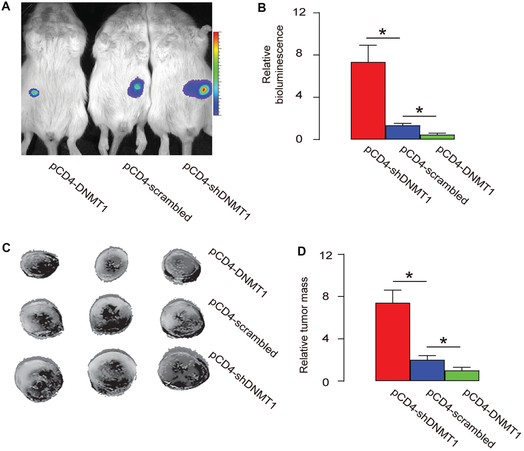 The male C57/BL6 mice at 12-week-old (SLAC Laboratory Animal Co. Ltd, Shanghai, China) were used for subcutaneous implantation of 106 AAV-pCMV-luciferase-transduced mouse Hepa1-6 cells at their flanks (n=3 for each group). From the second week after transplantation, intratumoral injection with 1011 viral particles pAAV-pCD4-DNMT1, or pAAV-pCD4-scrambled, or pAAV-pCD4-shDNMT1 was done every week till 8 weeks, when the mice were sacrificed and the bioluminescence and the size of the dissected tumor weights were measured. The bioluminescence detection was performed and the images were recorded with IVIS imaging system (Xenogen Corp., Alameda, CA, USA), with an acquisition time of 60-second and binning of 10.