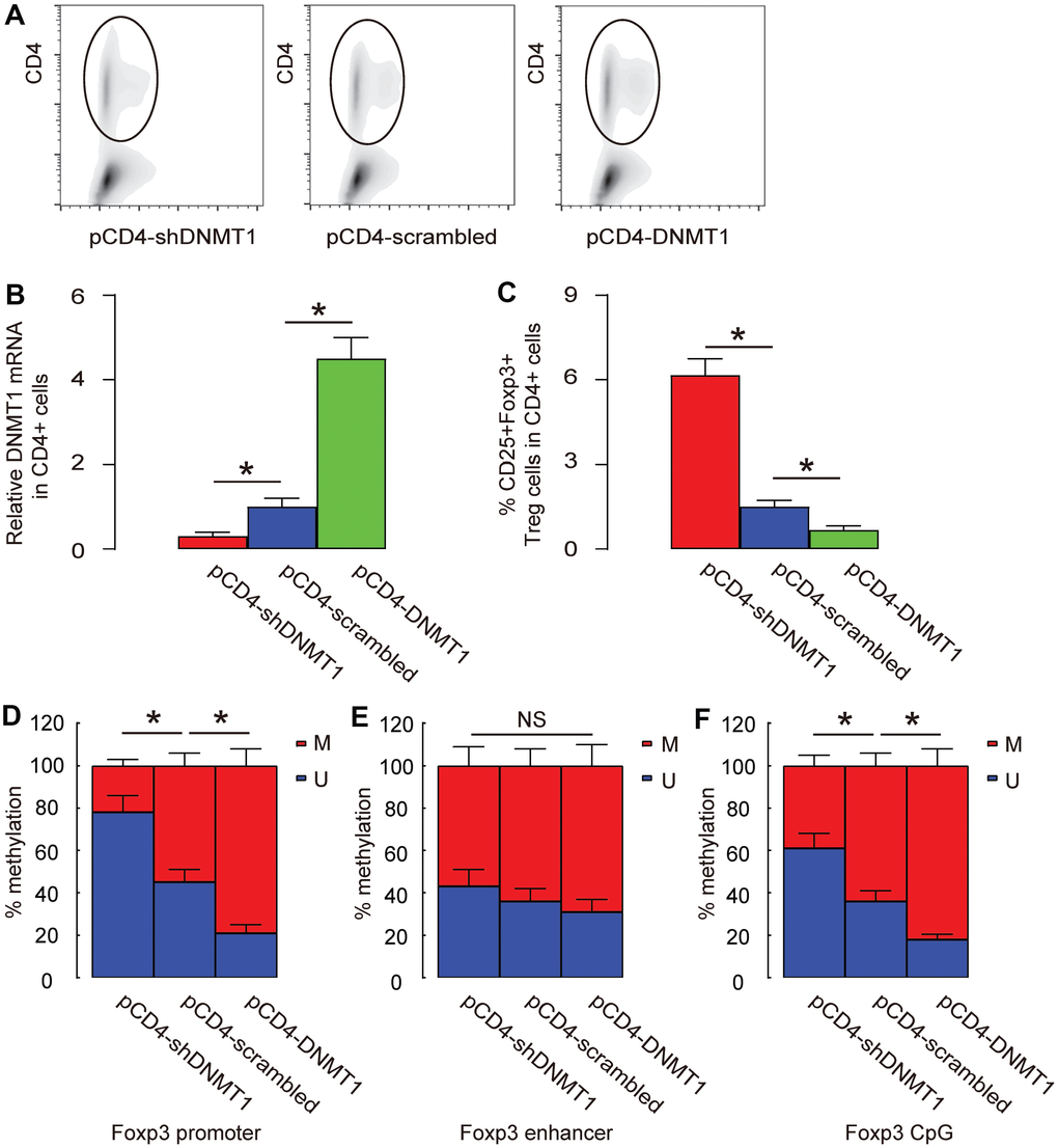 Foxp3 has 3 known sites that are susceptible for methylation, promoter, enhancer and CpG region. We analyzed the changes in methylation status at these sites in intratumoral T-cells by DNMT1 alterations. Intratumoral T-cells were purified by CD4-based flow cytometry (Figure 5A). First, we examined the DNMT1 levels in CD4+ T-cells and found that intratumoral injection with AAV-pCD4-DNMT1 significantly increased DNMT1 levels in intratumoral T-cells, while intratumoral injection with AAV-pCD4-shDNMT1 significantly decreased DNMT1 levels in intratumoral T-cells (Figure 5B). Moreover, CD4+CD25+Foxp3+ Treg cells were quantified in tumors and showed significant increase in AAV-pCD4-shDNMT1-injected tumor but significant decrease in AAV-pCD4-DNMT1-injected tumor (Figure 5C). We found that the methylation status of Foxp3 on promoter (Figure 5D) and CpG regions (Figure 5F), but not the enhancer region (Figure 5E), was significantly altered by pAAV-pCD4-DNMT1 or pAAV-pCD4-shDNMT1.