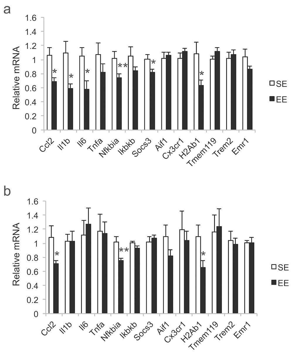 Female 10-month old WT C57BL/6N mice (National Institute on Aging, Aged Rodent Colonies) were randomized to live in either EE or SE conditions. For EE, mice were housed in large cages (63 cm x 49 cm x 44 cm, 5 mice per cage) supplemented with running wheels, tunnels, igloos, huts, retreats, wood toys, and a maze in addition to standard chow and water. For SE, mice were housed in standard mouse cage of 30.5 cm x 17 cm x 15 cm (5 mice per cage). Mice were housed in temperature (22-23 ºC) and humidity (30-70%) controlled rooms under a 12:12 light/dark cycle, with access to food and water ad libitum. Mice were fed with normal chow diet (NCD, 11% fat, caloric density 3.4kcal/g, Teklad (from Envigo), Indianapolis, IN). All animal experiments were carried out in compliance with the regulations of the Ohio State University Institutional Animal Care and Use Committee. In the study for mRNA expression within the hypothalamus and the amygdala, animals were housed in EE for 12 months and were sacrificed at 22 months of age (RT-PCR, n=8 per group) [13]. In the study for microglial morphology, animals were housed for 32 weeks until the study was ended at 17.5 months of age (n=4 for SE, n=5 for EE). While mice were housed at 5 mice per cage for the duration of the study, one mouse was excluded from our final SE set due to significant frailty and failure to gain weight. Body weight was measured weekly for the duration of the study, except weeks where noted for staff or access reasons. Food intake was measured weekly across the study for a total of 24 measurements. Food intake is reported as the remaining food weight, divided by the number of days between each measurement, divided by the number of mice per cage. Relative food intake is the same measurement, normalized to per gram body weight in each cage rather than the number of mice.