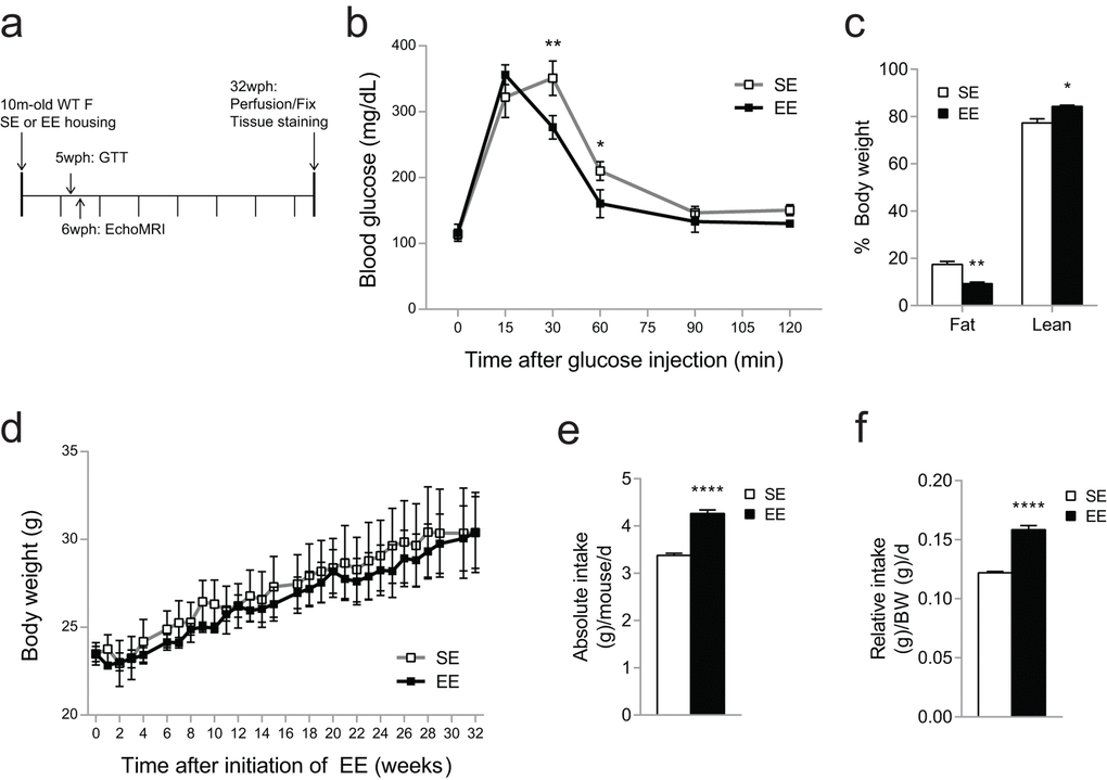 This evidence suggested there may be a phenotypic difference in microglia between the housing conditions. The aged microglial phenotype is thought to be a result of an accumulation of deleterious cellular changes over time. We hypothesized that, if the rate of this accumulation was different between housing conditions, the difference in microglial phenotype after EE would be detectable at an age when microglia otherwise show age-related changes. Therefore, we housed 10-month old mice in either SE or EE for 32 weeks, or 7.5 months, when mice are entering early old age (Figure 2a) [35]. Environmental (EE) or genetic (hypothalamic overexpression of BDNF) activation of the HSA axis is associated with metabolic improvement including reduced adiposity and improved glycemic control in middle age mice [13,14]. In order to detect early efficacy of EE, we assessed adiposity and glycemic control at five weeks post-housing. Five weeks of EE housing improved glucose tolerance (Figure 2b). EchoMRI revealed significantly reduced fat mass and increased lean mass in EE mice at 6 weeks (Figure 2c). There was no significant body weight difference between housing conditions across the 7.5-month period (Figure 2e) while EE mice consumed more food (Figure 2d). Overall, we observed the metabolic outcomes induced by EE consistent with previous studies [13].