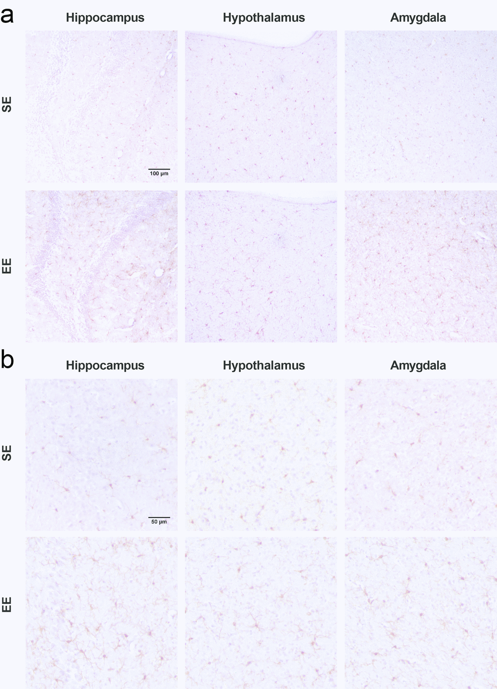 We next examined Iba1 IHC staining across the brain to investigate microglial changes following long-term EE of 7.5 months. Broadly, Iba1 staining appeared prominent in the hippocampus (HA), hypothalamus (HYP), and amygdala (AMY) of EE mice relative to SE mice (Figure 3). High magnification survey of these regions revealed SE microglia to have fewer and shorter observable processes in mostly non-reactive morphologies, consistent with previous reports on microglial morphology in older mice. In contrast, microglia from EE mice showed highly ramified morphology in all of the three brain regions, with variability across subfields and nuclei. This ramified morphology from EE mice was similar to young adult microglia, as seen in 3 month old female mice (Supplementary Figure 1). Unlike Iba1, GFAP showed no gross differences in astrocytic reactivity or morphology (Supplementary Figure 2).