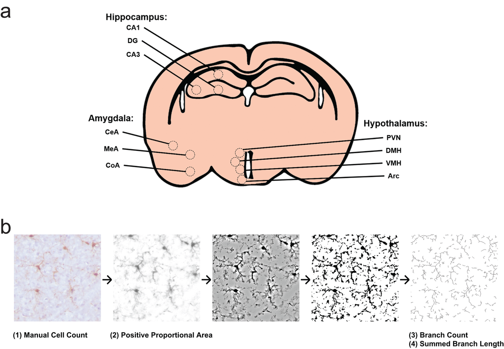 Based on these observations, we quantified the microglial cell morphology changes of prominent nuclei within HA, HYP, and AMY (Figure 4a). For subsequent analyses, we separated each region by subfield or nucleus: the hippocampus was divided into cornu ammonis 1 (CA1), cornu ammonis 3 (CA3), and dentate gyrus (DG); the hypothalamus was divided into arcuate nucleus (Arc), dorsomedial hypothalamic nucleus (DMH), paraventricular nucleus (PVN), and ventromedial hypothalamic nucleus (VMH); and the amygdala was divided into central nucleus of the amygdala (CeA), cortical nucleus of the amygdala (CoA), and medial nucleus of the amygdala (MeA). Microglial features were extracted at the level of field photomicrographs (Figure 4b).