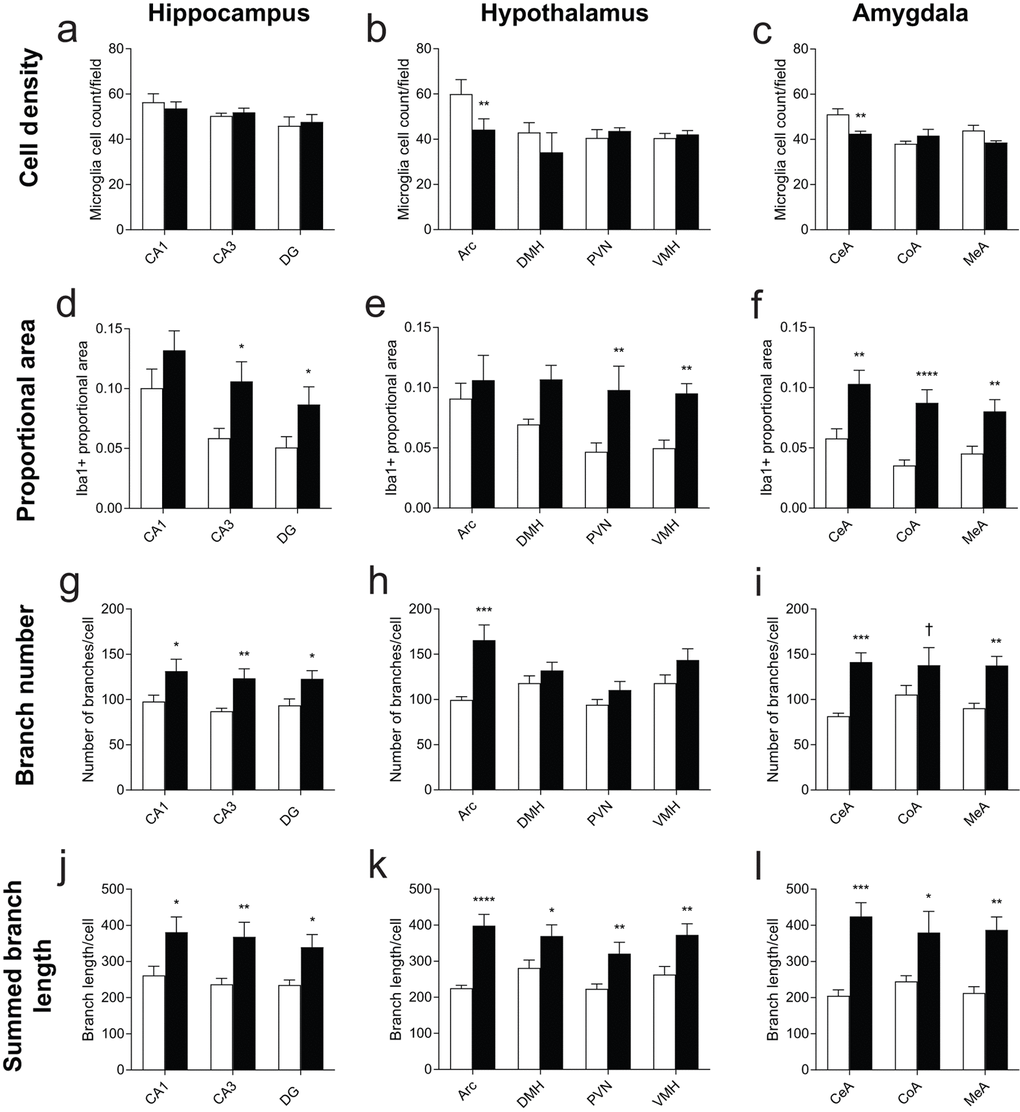 Cell density was roughly uniform within each of the three brain regions analyzed (Figure 5a-c). Cell decreases were observed only in both Arc and CeA after EE (Figure 5b, c). Iba1 positive proportional area was observed higher across all sections of EE compared to those of SE (Figure 5d-f). Iba1 positive area measurements are sensitive to changes in microglia cell number as well as microglial morphology [36]. Without increases in cell density, Iba1 positive area increases point to cellular hypertrophy. HA Iba1 increases were seen within subfields CA3 and DG (Figure 5d). Within HYP, proportional area increases were restricted to PVN and VMH. No differences were found in Arc, in which we also observed decreased cell density (Figure 5e). AMY exhibited significant proportional area increases across all three nuclei in EE, with the greatest increase in CoA (Figure 5f).