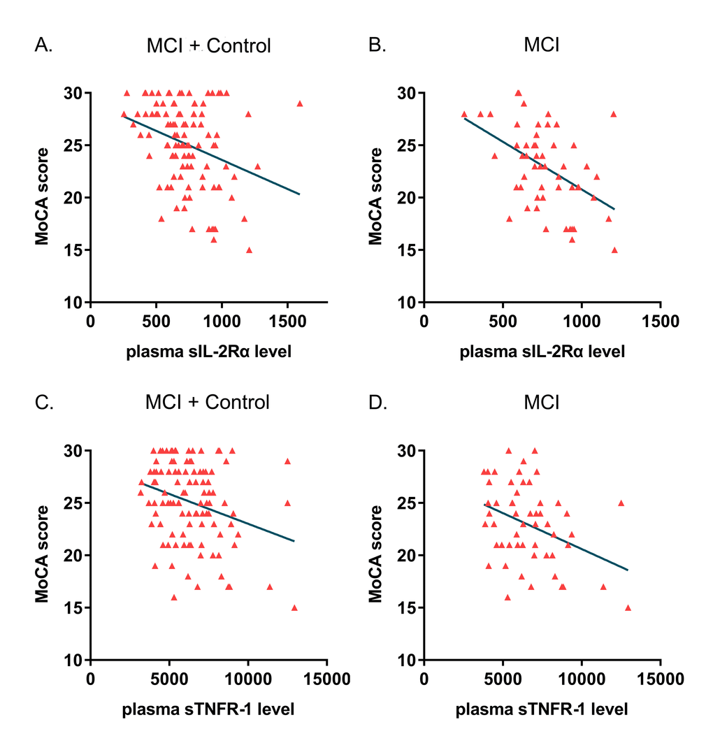 Aging has been associated with alterations of circulating cells producing cytokines or chemokines, and changes in the distribution of lymphocyte subset might be specific in different types of neurodegenerative disorders such as AD [28]. In agreement with a previous clinical study [26], our research data showed significantly inverse correlations between plasma sIL-2Rα concentration and cognition level evaluated by MoCA in both the whole study cohort and the MCI group. But this correlation was not detected in the control group. It is known that IL-2Rα plays a critical role in the signaling of IL-2 and the regulation of immune reactions [29]. Produced from the membrane-bound IL-2Rα, the soluble IL-2Rα could inhibit the IL-2 signaling and promote the proliferation of T cell, and was therefore regarded as the stable biomarker for T cell activation [30,31]. Laurent et al. have demonstrated a pivotal role of T cell infiltration in tauopathy and cognitive deficits in neurodegeneration [32]. Altogether, it is reasonable to speculate that there is an association between plasma sIL-2Rα level and cognitive impairment, which might be utilized for detecting disease progression.