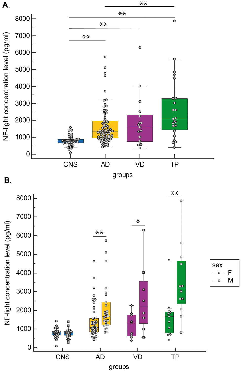 When gender-stratified analyses were performed, NF-light levels were significantly higher in males than in females in both AD and NAD (TP and VD groups) (Fig. 1B).