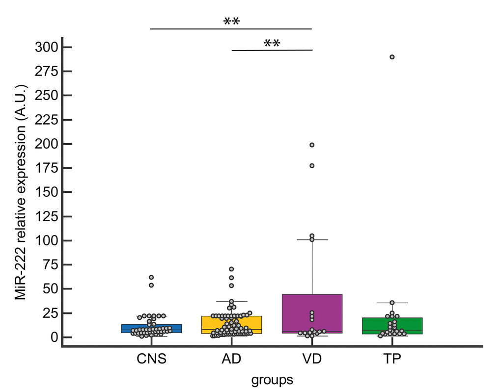 Among the four selected miRNAs, miR-222 CSF levels were significantly increased in VD compared to both AD and CNS (Fig. 2).