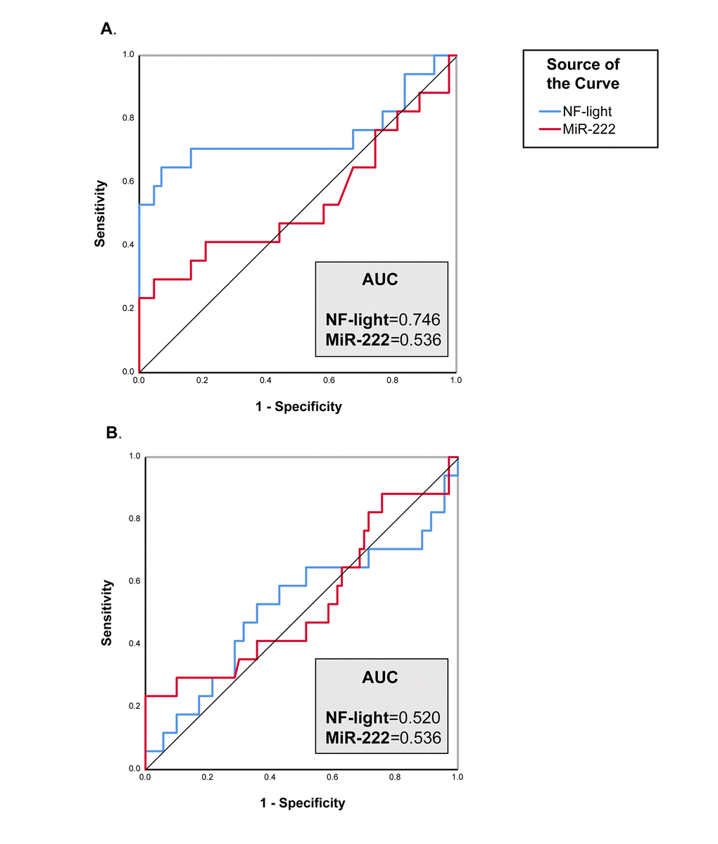 The diagnostic performance of each biomarker was than assessed using ROC curve analysis. NF-light concentrations performed better than miR-222 levels in discriminating VD from CNS (ROC analysis: The diagnostic performance of each biomarker was than assessed using ROC curve analysis. NF-light concentrations performed better than miR-222 levels in discriminating VD from CNS (ROC analysis: AUC=0.746) (Fig. 3A), but neither NF-light nor miR-222 were able to distinguish between AD and VD (Fig. 3B).