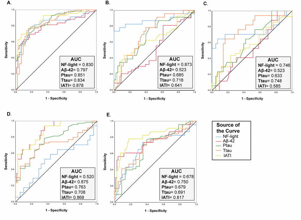 On the other hand, the performance of NF-light levels in discriminating AD from CNS was similar to that of classical AD biomarkers (ROC analysis: AUC=0.830, AD vs. CNS) (Fig. 4A), whereas a better performance than Aß42, t- and p-tau and IATI (a parameter combining Aß42 and t-tau) was observed in differentiating TP patients from CNS (ROC analysis: AUC=0.873, TP vs. CNS) (Fig. 4B). Furthermore, IATI had the best performance in differentiating between AD and NAD (ROC analysis: AUC=0.868, AD vs. VD and AUC=0.817, AD vs. TP) (Fig. 4D-E).
