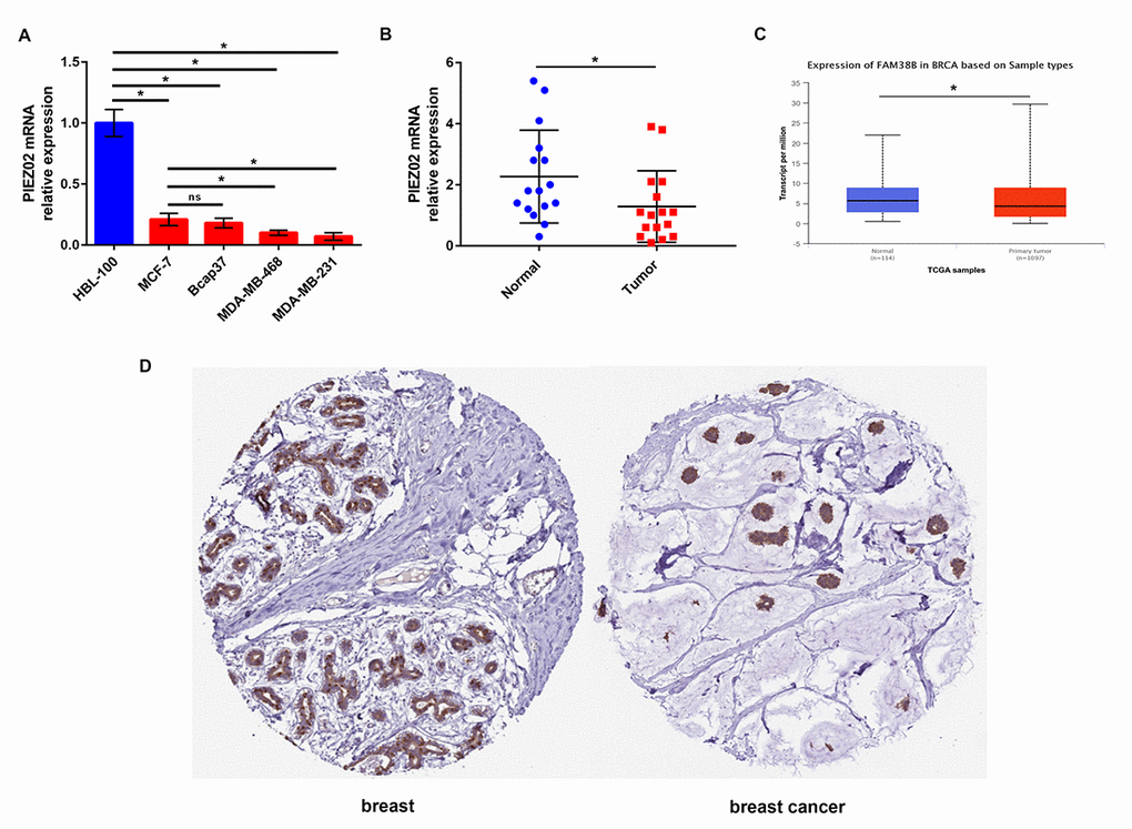 Next, we determined the expression of PIEZO2 in breast cancer cell lines and clinical samples compared with normal breast cell line and matched non-cancerous samples. Figure 2A showed that PIEZO2 expression in four breast cancer cell lines (MCF-7, Bcap37, MDA-MB-468 and MDA-MB-231) was significantly lower than that in normal breast cell line (HBL-100). Moreover, we found lower expression of PIEZO2 in high malignant cells (MDA-MB-468 and MDA-MB-231) compared with low malignant cell (MCF-7). Then, we compared the expression of PIEZO2 in breast cancer tissues with matched adjacent normal breast tissues and suggested that cancer tissues showed a significantly decreased PIEZO2 expression (Figure 2B). To further confirm under-expression of PIEZO2 in breast cancer, corresponding breast cancer expression data from TCGA were analyzed using UALCAN database (Figure 2C). Intriguingly, a similar result was observed. Furthermore, the protein level of PIEZO2 was also decreased in breast cancer tissues compared with normal breast tissues (Figure 2D).