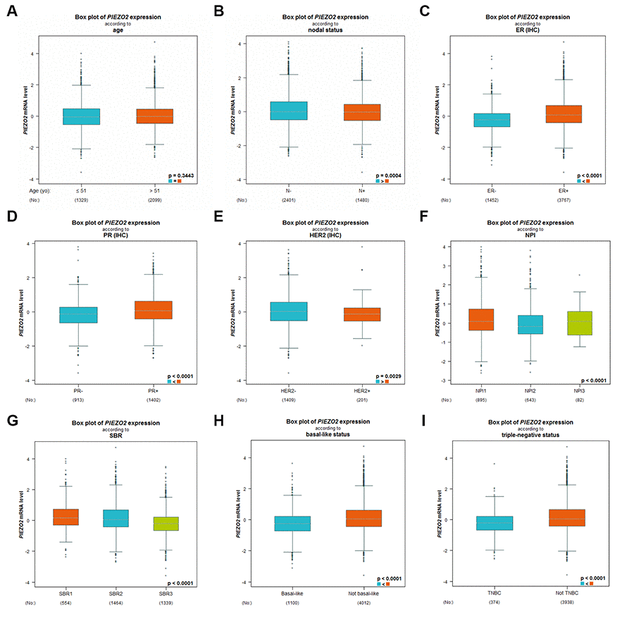 Subsequently, we further studied the expression differences of PIEZO2 based on different clinicopathological parameters in breast cancer using bc-GenExMiner database. As shown in Figure 3A, no significant difference between the <51 years and >51 years was observed. Figure 3 also demonstrated that PIEZO2 expression was markedly upregulated in breast cancer with nodal negative (Figure 3B), ER positive (Figure 3C), PR positive (Figure 3D) and HER2 negative (Figure 3E) status. PIEZO2 expression was inversely correlated with NPI score and SBR grade as presented in Figure 3F and Figure 3G, respectively. Additionally, we also discovered that expression of PIEZO2 was significantly decreased in basal-like (Figure 3H) and triple negative (Figure 3I) breast cancer patients compared with not basal-like and not triple negative breast cancer, respectively. We further investigated the relationship between PIEZO2 expression and clinicopathological characteristics using TCGA breast cancer data. Chi-square test revealed that PIEZO2 expression was significantly associated with ER status (P < 0.001), PR status (P < 0.001), HER2 status (P < 0.001), T stage (P < 0.001), N stage (P = 0.0221) and pathologic stage (P = 0.0010) (Table 1). All these findings suggest that PIEZO2 expression in breast cancer is significantly declined and negatively correlates with progression of breast cancer.