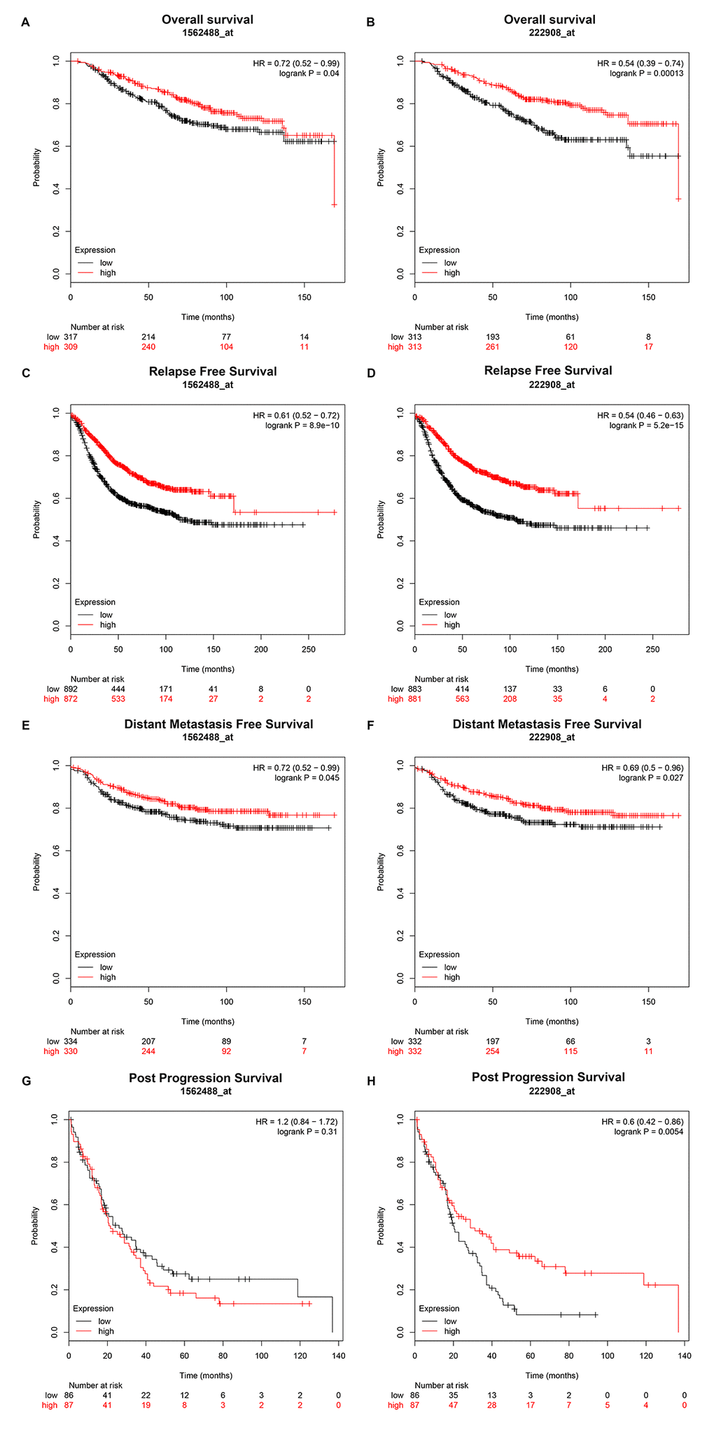 | GSE11121 | Distant Metastasis Free Survival | 200 | 219602_s_at | 0.002372 | 0.50(0.32-0.78) |