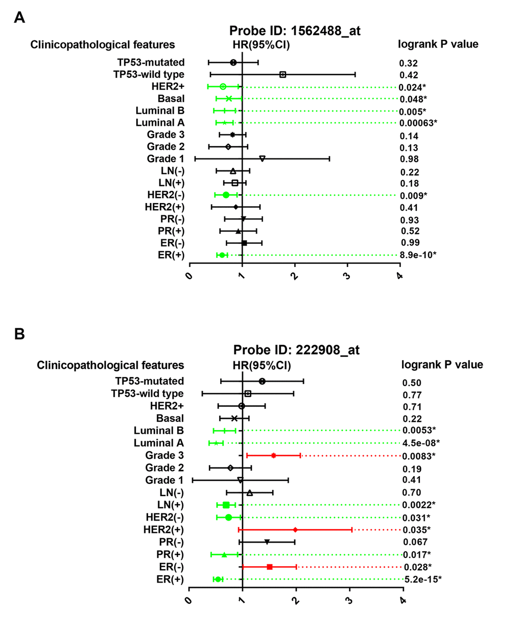 The prognostic roles of PIEZO2 in breast cancer patients according to various clinicopathological features were also determined by Kaplan Meier-Plotter database. The data were presented in Figure 5 which demonstrated that PIEZO2 overexpression was significantly associated with better prognosis in ER-positive, HER2-negative, luminal A and luminal B breast cancer in the two probes. Furthermore, we also found that high expression of PIEZO2 in basal-like breast cancer patients indicated a better prognosis in the probe 1562488_at. In the probe 222908_at, a positive correlation of PIEZO2 expression and survival in PR-positive and lymph node-positive breast cancer patients but a negative association between PIEZO2 expression and survival in ER-negative, HER2-positive and pathological grade 3 breast cancer patients were observed.