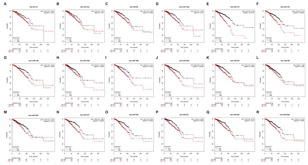To identify PIEZO2 that can be modulated by miRNAs, starBase database was utilized to predict upstream miRNAs of PIEZO2. In total, 182 miRNAs could potentially regulate PIEZO2 as shown in Table S1. It has been widely acknowledged that there exists an inverse association between miRNA and mRNA expression [12–15]. Therefore, we further assessed expression correlations between each predicted miRNA and PIEZO2 using TCGA breast cancer data. We observed that 42 miRNAs expression were statistically inversely associated with PIEZO2 expression (Table 3). Next, the prognostic values of the 42 miRNAs in breast cancer were determined by Kaplan Meier-Plotter database. The results demonstrated that breast cancer patients with high expression of 18 miRNAs (let-7d-5p, miR-33a-5p, miR-98-5p, miR-130b-3p, miR-137, miR-138-5p, miR-186-5p, miR-193a-3p, miR-196a-5p, miR-301a-3p, miR-421, miR-429, miR-454-3p, miR-579-3p, miR-580-3p, miR-671-5p, miR-934 and miR-2355-5p) indicated a poor prognosis (Figure 6). Moreover, we also detected the 18 miRNAs expression in breast cancer using OncomiR database. As listed in Table 4, only 11 miRNAs (let-7d-5p, miR-33a-5p, miR-98-5p, miR-130b-3p, miR-137, miR-193a-3p, miR-196a-5p, miR-301a-3p, miR-421, miR-454-3p and miR-671-5p) were significantly upregulated in breast cancer when compared with normal controls. Subsequently, by text mining for the 11 miRNAs, we found that 5 miRNAs (miR-130b-3p, miR-196a-5p, miR-301a-3p, miR-421 and miR-454-3p) were reported to function as oncogenes in breast cancer (Table 5). In order to further validate the inverse regulation of the five miRNAs in PIEZO2, we determined the mRNA and protein expression levels of PIEZO2 after knockdown of the five miRNAs. As shown in Figure S1, PIEZO2 was significantly upregulated in miRNAs-knockdown groups compared with negative control group. Taken together, the 5 miRNAs, with the features of upregulation in breast cancer, indicating poor prognosis, possessing negative associations with PIEZO2 expression and being reported to act as oncogenes, were the most potential upstream miRNAs that could inversely regulate PIEZO2 in breast cancer.