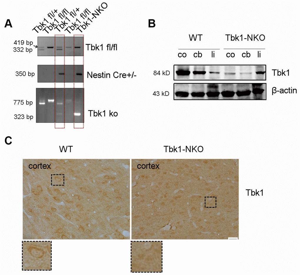 To investigate the role of Tbk1 in the central nervous system (CNS), we generated Tbk1 neuronal progenitor cell-conditional KO mice by crossing Tbk1-flox mice [10] with Nestin-Cre mice. The resulting Tbk1fl/flNestin-Cre (hereafter called Tbk1-NKO) mice, and Tbk1+/+Nestin-Cre wild-type (WT) control mice were genotyped by PCR (Figure 1A). Western blot analyses readily detected Tbk1 in the cortex, cerebellum, and liver of WT mice. In contrast, Tbk1 expression was normal in the liver, but barely detectable in the cortex and cerebellum of Tbk1-NKO mice (Figure 1B). Neuron-specific deletion was further confirmed through Tbk1 immunostaining (Figure 1C).
