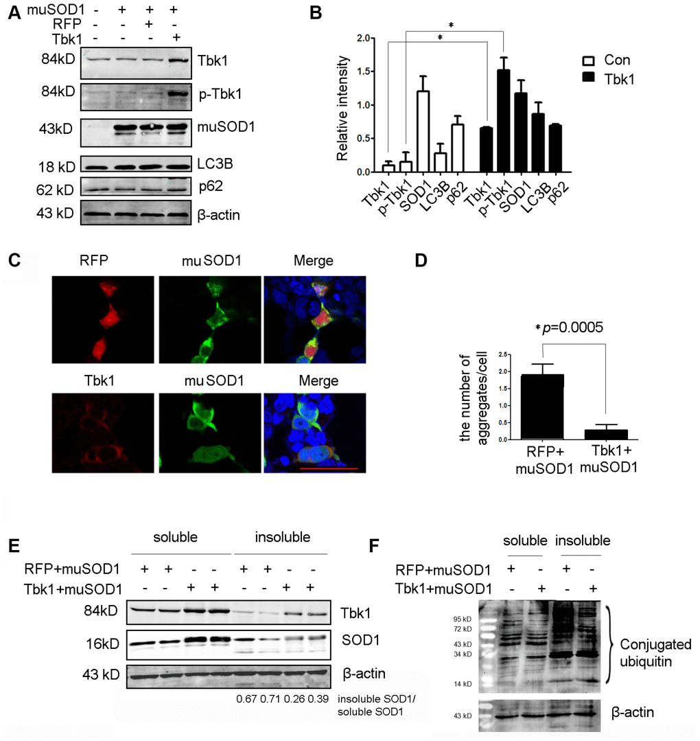 Conversely, to assess whether Tbk1 over-expression could enhance the degradation of mutant SOD1, NSC34 cells were co-transfected with mutant SOD1G93A-encoding plasmids and either a Tbk1 expression vector or a control (RFP) vector. Tbk1 over-expression led to a substantial increase in both Tbk1 and p-Tbk1, but did not alter SOD1G93A expression (Figure 10A, 10B). We also examined the effect of Tbk1 over-expression on autophagy induction by assessing LC3B and p62 levels. No expression changes were observed in these proteins, indicating that increased Tbk1 expression is insufficient to promote autophagy (Figure 10A, 10B). Interestingly, however, Tbk1 over-expression prominently reduced the number and size of SOD1G93A aggregates (Figure 10C–10D). Furthermore, western blot analysis revealed that Tbk1 expression increased soluble SOD1G93A levels while reducing insoluble SOD1G93A, causing a 37% reduction in the insoluble/soluble mutant SOD1 ratio compared to control RFP cells (Figure 10E). Meanwhile, Tbk1 over-expression also decreased the level of polyubiquitinated proteins in the insoluble fraction (Figure 10F).