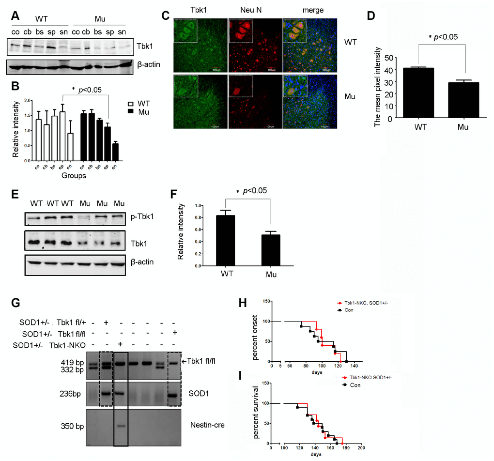 Considering that Tbk1 might be involved in the degradation of mutant SOD1, we compared Tbk1 protein levels in mutant SOD1 mice and littermate controls.