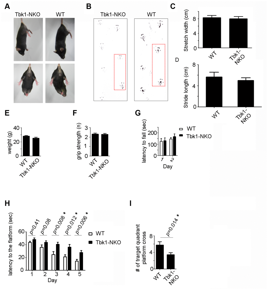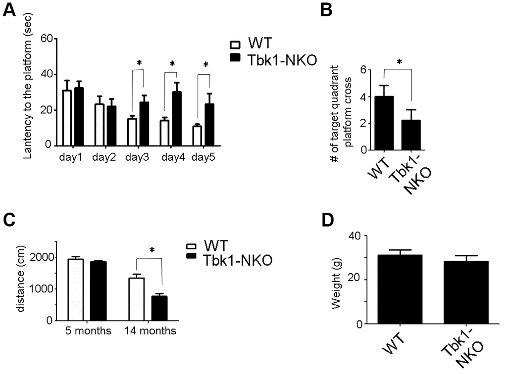 To assess the behavioral impact of Tbk1 deletion, locomotor and memory functions were evaluated in age-matched Tbk1-NKO and WT mice. Five-months-old Tbk1-NKO mice showed normal clasping and gait (footprint tracing) (Figure 2A–2D). Body weight, grip force, and latency to fall (Rotarod test) were also comparable in Tbk1-NKO and control mice (Figure 2E–2G). The Morris Water Maze test was next used to evaluate spatial learning and reference memory. Tbk1-NKO mice showed a significant increase in the time to reach the platform from day 3 to day 5, compared to WT mice. On day 6, a 60-second probe trial was administered in which the platform was removed. Trial results showed that the number of target quadrant crosses was reduced by 40% in Tbk1-NKO mice (Figure 2H, 2I; Supplementary Figure 1A). Interestingly, when the experiment was repeated in older mice (14 months), no significant decline in the time to reach the platform was observed over 5 days of training in Tbk1-NKO mice. However, swimming distances and successful target quadrant crosses were still reduced by 43.2% and 45%, respectively, compared to WT mice. Meanwhile, body weights were comparable between Tbk1-NKO and WT mice (Figure 3A–3D). These data showed that neuronal conditional Tbk1 knockout is associated with cognitive impairment and reduced locomotor activity in mice.