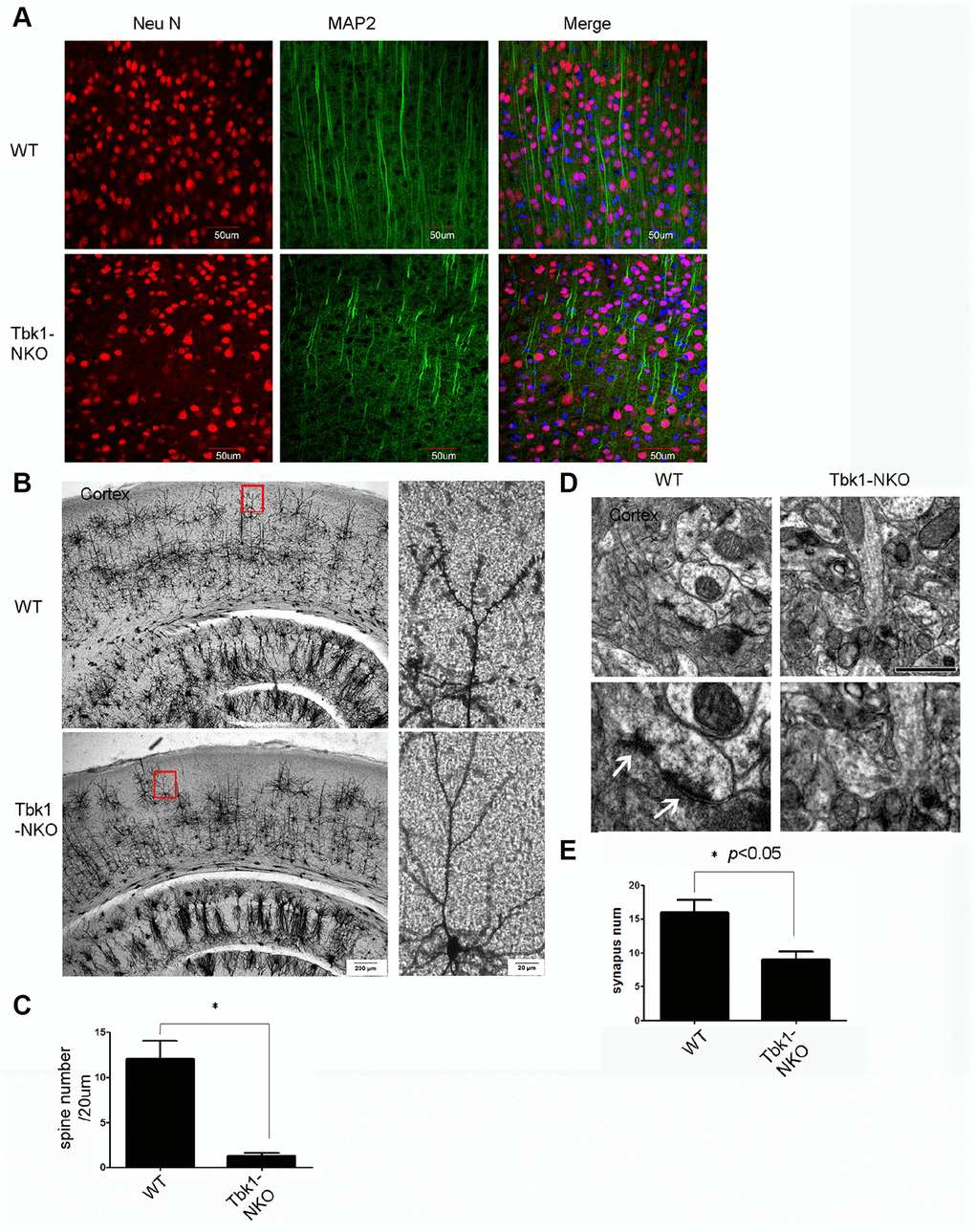 We applied both immunostaining and special stains to evaluate the effects of Tbk1 deletion on neuronal and glial morphology. Abnormally shaped neurons were observed in the cortex of Tbk1-NKO mice upon immunostaining against neurofilament (NF) and microtubule associated protein 2 (MAP2) as a dendritic marker (Figure 4A; Supplementary Figure 1C). Additionally, Golgi-Cox staining revealed a marked decrease in the density of dendritic spines in the cortex and hippocampus of Tbk1-NKO mice (Figure 4B, 4C; Supplementary Figure 2). Consistent with reduced dendritic spine density, TEM images showed that synapse numbers were also dramatic decreased in the cortex of Tbk1-NKO mice (Figure 4D, 4E).