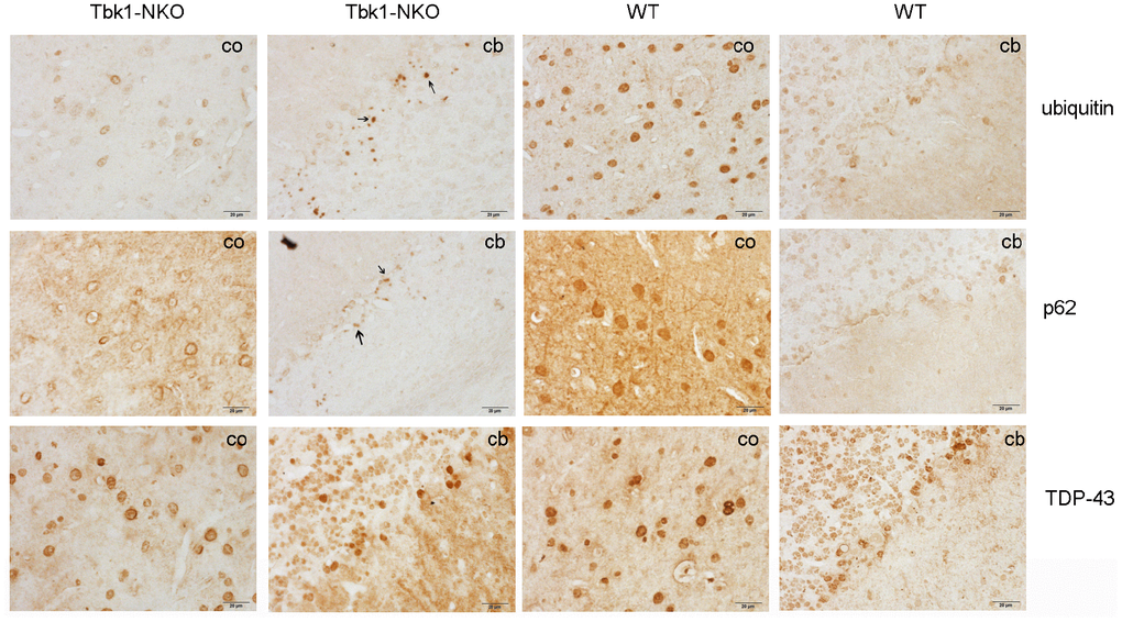 In view of the impaired behavioral performance of Tbk1-NKO mice, and based on evidence linking alterations in autophagy receptors such as p62 and neurodegenerative diseases -including ALS-, the expression of the autophagy-related proteins p62 and ubiquitin was evaluated by immunostaining in 14-month-old Tbk1-NKO mice. Whereas p62- and ubiquitin-positive aggregates were identified in the cerebellum, we did not observe TDP-43-positive inclusions, another common marker of ALS, FTD, and other neurodegenerative diseases (Figure 5).