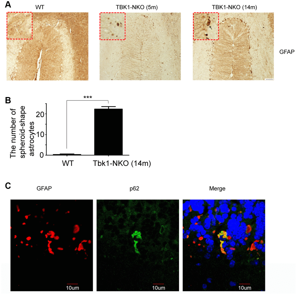 Astrocyte activation and degeneration have been reported in ALS. To examine possible pathologic changes in glia resulting from Tbk1 deficiency, microglia and astrocytes were analyzed, respectively, by IBA1 and GFAP immunostaining. While these analyses did not suggest obvious glial activation in the hippocampus or cortex (Supplementary Figure 1B), a stronger GFAP staining was observed, compared to WT mice and especially at 14 months of age, in the Purkinje cell layer of the cerebellum of Tbk1-NKO mice (Figure 6A, 6B). Furthermore, the presence of glial degeneration was suggested by a significant number of GFAP-positive astrocytes that presented an abnormal, spheroidal shape.