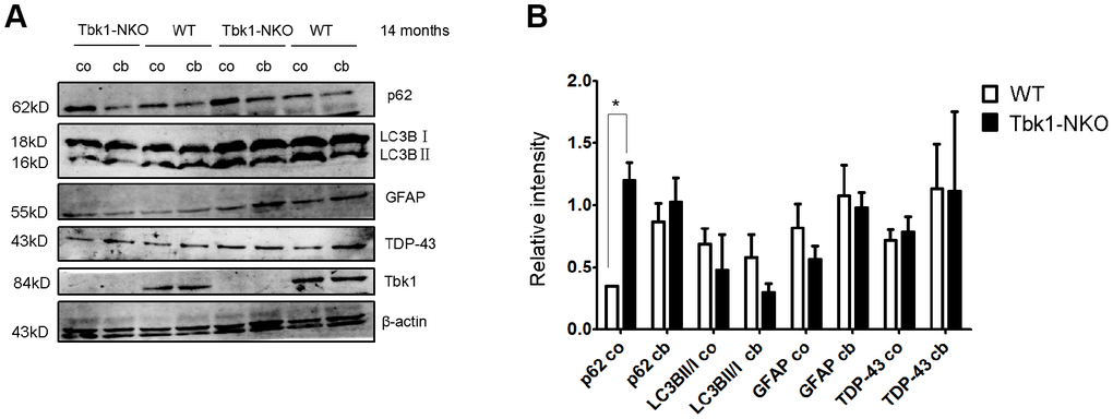 p62 (sequestosome 1) functions as a cargo receptor for autophagy and a shuttling factor of polyubiquitinated proteins to the proteasome [21]. p62-positive inclusions thought to result from impaired autophagy flux in neurons and astrocytes have been reported in specimens from ALS-FTD patients [22]. Using immunostaining, we detected formation of p62 aggregates in abnormal cerebellar astrocytes from Tbk1-NKO mice (Figure 6C). Western blots also showed elevated expression of p62 in both cerebellum and cortex of Tbk1-NKO mice, but the increase was significant only in the cortex (Figure 7A). The expression of other common autophagy markers, namely LC3B proteins, as well as GFAP and TDP-43 levels, were also studied by western blot. The LC3BII/LC3BI expression ratio was not changed in Tbk1-NKO mice compared to WT. Likewise, no differences between genotypes were seen for the expression of GFAP and TDP-43 (Figure 7A, 7B).