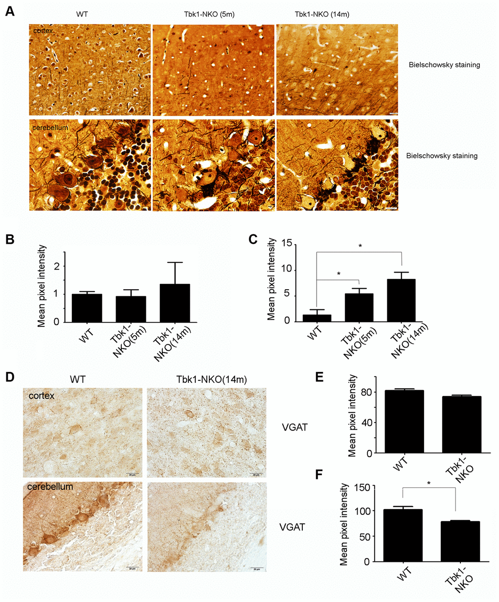 To examine in greater detail the pathologic changes seen in the cerebellum and cortex of Tbk1-NKO mice, Bielschowsky staining was carried out in samples from 5 and 14 months old mice. Dendritic swelling in the Purkinje cell layer and neurofibrillary tangles in the cortex were evident in Tbk1-NKO mice aged 14 months (Figure 8A–8C). We speculated that the dendritic swelling observed in Purkinje neurons (and also possibly in basket and stellate cells that synapse with them) might be related to impaired GABA release. Supporting this hypothesis, reduced expression of the GABA transporter VGAT was observed by immunohistochemistry in the cerebellum of 14-month-old Tbk1-NKO mice (Figure 8D–8F).