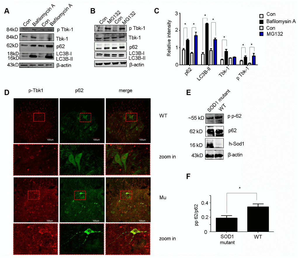 Next, we examined whether p-Tbk1 was involved in p62 aggregation in motor neurons. Indeed, p-Tbk1 co-localized with p62 in the aggregates (Figure 9D). Mutant SOD1 is known to interact with p62 to form aggregates with disruptive effects on the protein degradation pathway [19, 25], which raises the possibility that mutant SOD1 could disrupt the ability of Tbk1 to regulate p62 function. To test this idea, the phosphorylation of p62 at Ser403 was assessed in cells transfected with a mutant SOD1 protein (SOD1G93A). We found that SOD1G93A expression partially decreased p62 phosphorylation (Figure 9E, 9F).