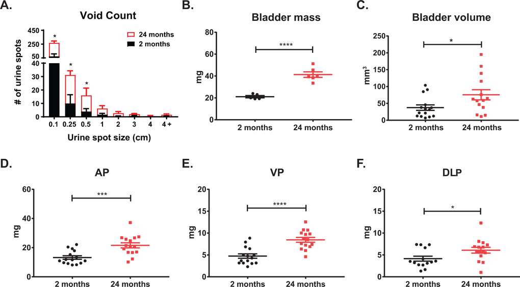 The lifespan of different strains of mice have been extensively characterized [21]. Generally, the period between three to six months in mice corresponds to humans at approximately 20-30 years of age. In C57Bl6/J mice, 75% survive past 2 years of age, and only 50% survive past 27 months; mice between 18-24 months of age correspond to humans 56-69 years of age [22]. Since wild-type mice less than a year old do not typically develop prostatic diseases (benign or malignant), a comprehensive analysis of the physiology and histology of the lower urinary tract with aging has not been rigorously assessed. Using void spot assays (VSA) to assess urinary function in wild-type, untreated mice at 2 months (young) and 24 months (aged) of age, we observed a significant increase in the number of urine spots in the aged cohort of mice compared to the young (Figure 1). Additionally, the aged cohort has a significant number of smaller urine spots compared to the young cohort consistent with LUTD. Upon examination of the dissected lower urinary tracts, we observed a significant increase in bladder mass and retained urine volume (Figure 1B-C). Examination of the separate prostate lobes [anterior (AP), ventral (VP), dorsolateral (DLP)] showed a significant increase in mass in the aged cohort compared to the young cohort (Figure 1D-F). These results are similar to changes we found previously with the hormone induced mouse model of LUTD [17]. When these morphometric measurements were normalized to body mass, bladder mass, total prostate lobes (hemiprostate), AP, and VP remained statistically significant with aging (Table 1). This suggests that normal aging recapitulates symptoms of BPH with corresponding changes in prostate and bladder, independent of body mass.
