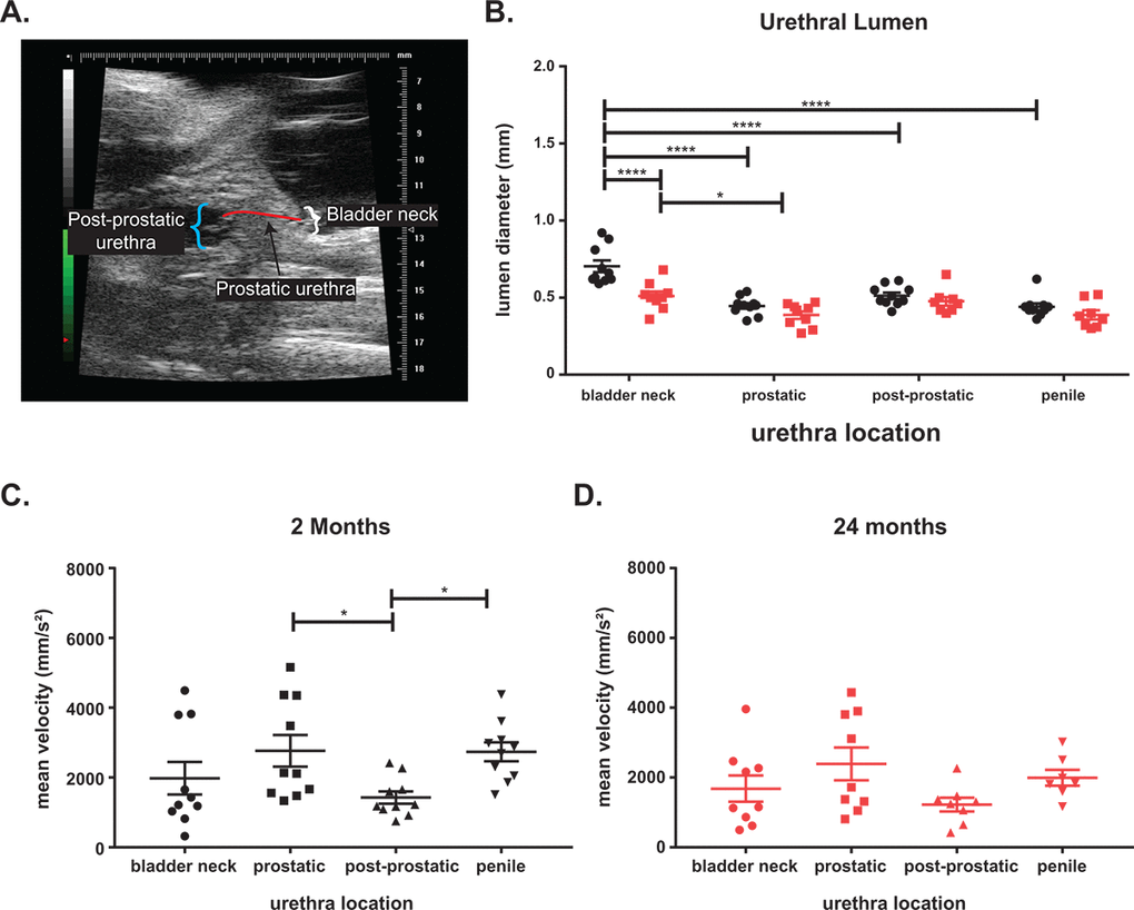 Contrast-enhanced doppler ultrasound was performed on young and aged mice. After anaesthetizing the mice with isoflurane, bladders were catheterized via abdominal insertion. Once the bladder was visualized by ultrasound, the contrast agent, DEFINITY® (Lantheus, Billerica, MA), was injected into the bladder through the catheter. Using Doppler, the contrast agent velocity was measured through the urethra at the bladder neck, prostatic urethra, and post-prostatic urethra. B-mode imaging was also used to measure the diameter at those respective points.