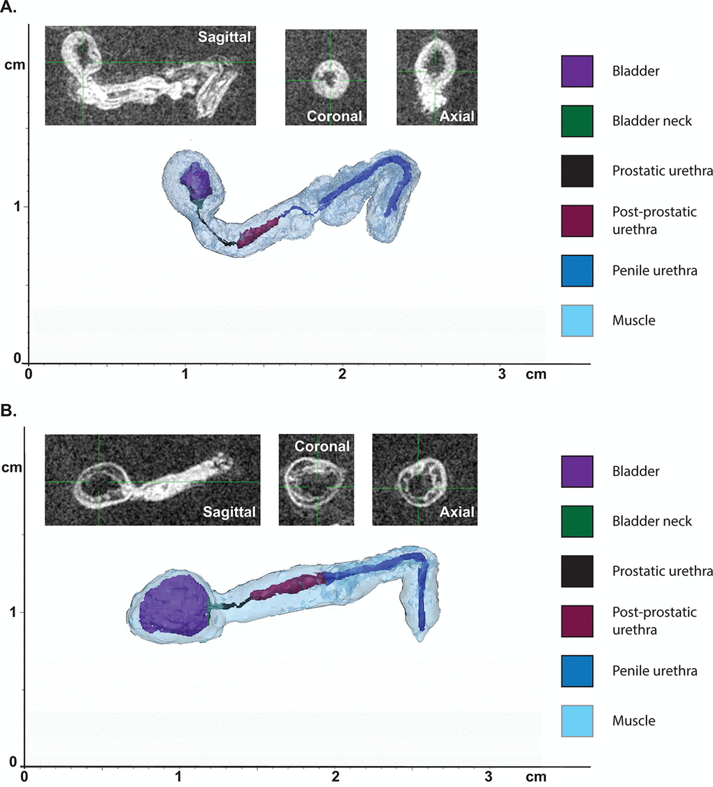 The MR images, containing data from the entire urogenital tract of 9 mice, were imported into MIMICS (Materialise, Leuven, Belgium) and 3-matic (Materialize). Key features were measured, including bladder volume, detrusor muscle volume, bladder neck diameter/volume/length, urethra diameters, urethra total length, and urethra segmental lengths (Figure 3, Table 2). The anatomical boundaries of each urogenital tract were identified and manually segmented in MIMICS (Figure 3). Once each boundary was delineated, 3D models of each urogenital tract were processed in 3-matic. Bladder lumen and detrusor muscle volumes were calculated by delineating the 3D bladder fluid volume from the bladder wall and then calculating the volume of each by totaling the number of voxels in each part. Bladder neck diameter was determined by finding the mean tangent points between the urethra opening and the bladder wall on the opposing sides of the bladder (Figure 3). Urethral diameters, total length, and segmental lengths were found by segmenting and measuring the urethral opening at various points on the 3D segmented model.