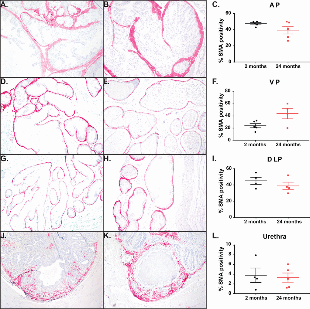 One effective treatment of BPH is the use of α-adrenergic blockers to relax the smooth muscle in the bladder and the prostate. To examine the effect of aging on the distribution of smooth muscle within the mouse, we quantified the percentage of smooth muscle α-actin (SMA) within the prostate lobes (Figure 4A-I). We observed that the smooth muscle found within the prostate stroma remains unchanged with age. While the anatomy of the mouse prostate (lobular) is different than that of the human (capsular), the prostatic urethra region has the smallest urethral luminal diameter and is encompassed by the rhabdosphincter similar to the encapsulated human prostate [28]. Examination of the smooth muscle immediately surrounding the prostatic urethral lumen shows no difference in percentage of SMA between the young and aged cohort (Figure 4J-L). This suggests that smooth muscle within the stroma is not contributing to the age related LUTD seen in mice.