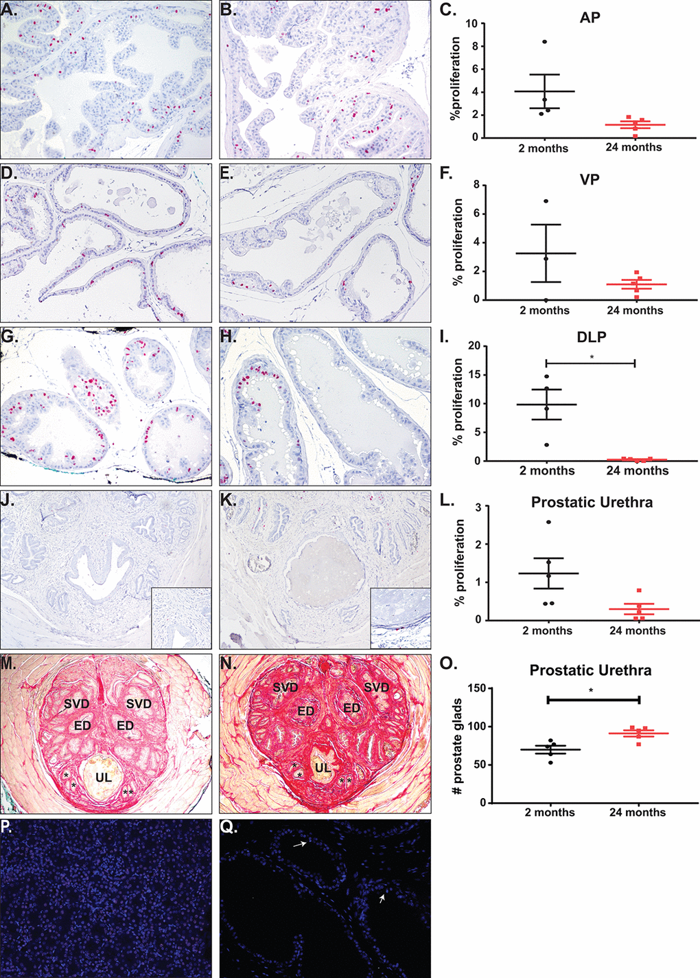 While the prostate is thought to be a quiescent organ post-puberty, we discovered the prostate mass increased significantly between the young and the aged mice (Figure 1D-F). Previous studies have shown that prostate proliferation in mature mice is ~1% [29,30]. To quantify the amount of proliferation that occurs within the mice during a four-week treatment, we treated mice orally with BrdU in water for a week and examined proliferation changes at the end of the study. Anterior and ventral prostates were undergoing ~1-5% proliferation, regardless of age (Figure 5A-F). Although not significantly different, there is a trend towards a decrease in proliferation with age. Dorsolateral prostates showed a significant increase in BrdU incorporation in the young mice as compared to the aged mice (Figure 5G-I). This higher proliferation rate in the young mice could indicate that DLP maturation to quiescence occurs after 2 months of age. We also examined proliferation of prostatic tissue immediately surrounding the urethra at the midpoint of the prostatic urethra. Previous studies have shown that an increase in prostate ducts within the region are associated with urinary dysfunction [17]. Examination of BrdU incorporation within the prostatic urethra shows no change in proliferation rate in the aged mouse cohort compared to the young mice (Figure 5J-L). However, examination of prostate ducts within the midpoint of the prostatic urethra showed a significant increase in duct number without a corresponding change in BrdU incorporation (Figure 5M-O). This suggests that while the rate of proliferation does not change with age within the prostate lobes and prostatic urethra, the constant proliferation over time does increase prostate ducts and may be contributing to LUTD. Examination of apoptosis within the prostate lobes and the midpoint of the prostatic urethra showed a < 0.5% apoptosis with no difference between young and aged mice (Figure 5P-Q).