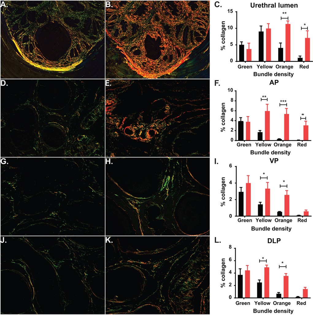 In human prostate, an increase in collagen deposition and fibrosis has been identified as a contributing factor of urinary dysfunction [31]. In the mouse, previous studies have shown a significant increase in fibrosis and collagen deposition within the prostatic urethra in mice experiencing LUTD, suggesting that collagen changes can alter normal urination [17,32,33]. We calculated collagen deposition at the midpoint of the prostatic urethra and in the prostate lobes by quantifying birefringence of picrosirius red (PSR) staining under circular polarized light. After exploring the periurethral region of the mouse prostatic urethra, we observed an age-related, significant increase in total collagen, with the most significant increases in the thickest collagen bundles (orange and red; Figure 6A-C). Additionally, examination of the prostate lobes showed a significant increase in collagen of the aged mice corresponding to the thicker collagen bundles (yellow, orange, and red; Figure 6D-L). This suggests that collagen is accumulated over time, leading to changes within the prostate lobes and the prostatic urethra. This could also contribute to the LUTD observed in the aged mice.