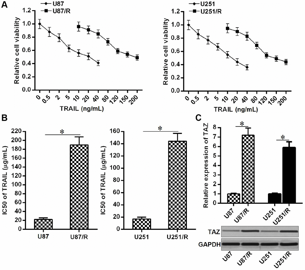 To study the TRAIL resistance in glioma, we established the TRAIL-resistant U87 and U251 cell lines (U87/R and U251/R) through gradual exposure to increasing concentrations of TRAIL. Results of MTT assays confirmed the low drug sensitivity of U87/R and U251/R cells to TRAIL (Figure 1A). We showed that IC50 of TRAIL to U87/R was 7.67 fold higher than its parental U87 cell line. Meanwhile, IC50 of TRAIL to U251/R was 6.95 fold higher than its parental U251 cell line (Figure 1B). Next, we compared the expression of TAZ between TRAIL-resistant glioma cells and their parental cell lines. We observed that expression level of TAZ in U87/R and U251/R cells was obviously upregulated at both the mRNA level and protein level compared to the U87 and U251 cells, respectively (Figure 1C). Overexpression of TAZ may be responsible for formation of TRAIL resistance in glioma.