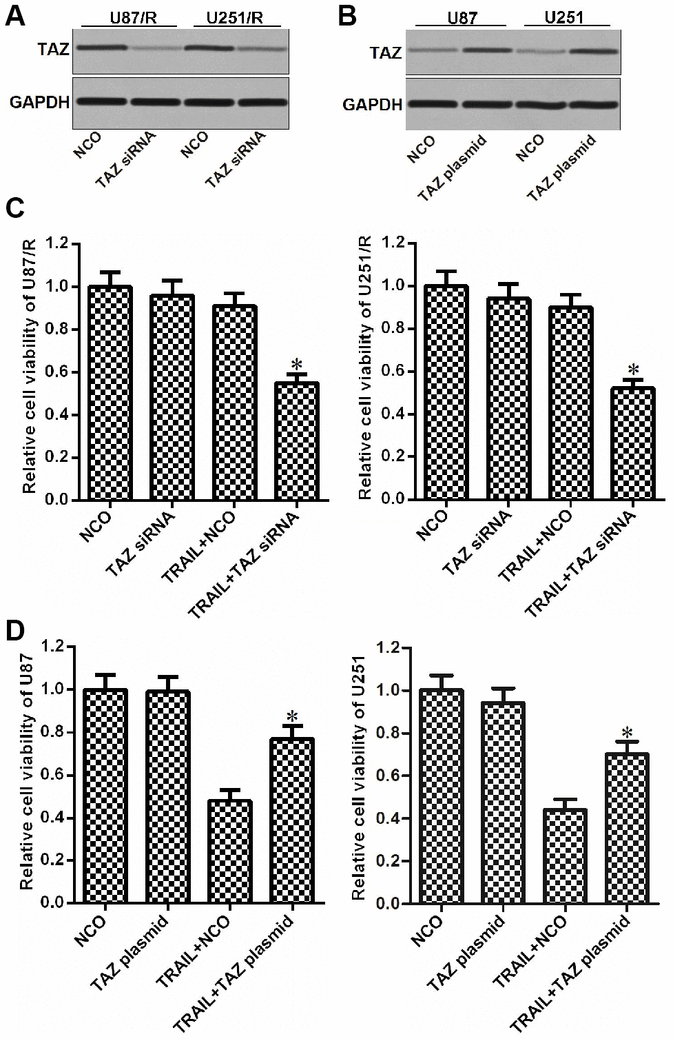 To study the role of TAZ in the formation of TRAIL resistance in glioma, we changed the expression of TAZ in U87/R, U251/R (Figure 2A), U87 and U251 cells (Figure 2B) by using TAZ siNRA or plasmid respectively. As TRAIL at the concentration of 10 ng/mL induced slight cytotoxicity to U87/R and U251/R and significant cytotoxicity against U87 and U251, we chose this concentration of TRAIL to study the effect of TAZ on the drug sensitivity in the following experiments. Interestingly, we found that knockdown of TAZ reduced the drug resistance of U87/R and U251/R to TRAIL (Figure 2C). However, overexpression of TAZ in U87 and U251 cells induced their TRAIL resistance (Figure 2D). Taken together, we demonstrated that overexpression of TAZ was responsible for formation of TRAIL resistance in glioma.