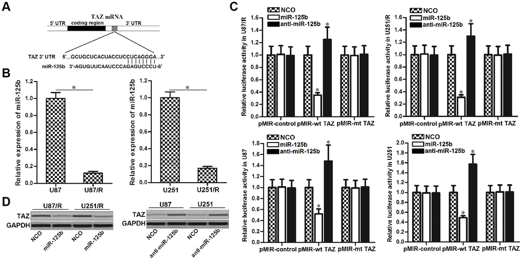 Recombinant pcDNA3.1 plasmid carrying TAZ open reading frame (TAZ plasmid), Recombinant pcDNA3.1 plasmid carrying TAZ 3′ UTR fragment with miR-125b seed region (3′ UTR plasmid), TAZ siRNA (Santa Cruz Biotechnology, Santa Cruz, CA, USA), hsa-miR-125b mimic (5′-AGUGUUCAAUCCCAGAGUCCCU-3′, 50 pmol/ml, GenePharma Co. Ltd, Shanghai, China), anti-hsa-miR-125b (5′-AGGGACUCUGGGAUUGAACACU-3′, 80 pmol/ml, GenePharma Co. Ltd), negative control oligonucleotide (NCO, 5′-CUCAUUCCCAUAUGGUCGCAAG-3′, 50 pmol/ml, GenePharma Co. Ltd) were transfected into cells by using Lipofectamine™ 2000 (Invitrogen, CA, USA) according to the manufacturer’s instructions. Recombinant lentiviral expression vector carrying miR-125b precursor was constructed by GenePharma Co. Ltd. The lentiviruses were transfected into the U87/R cells according to the manufacturer’s instructions.