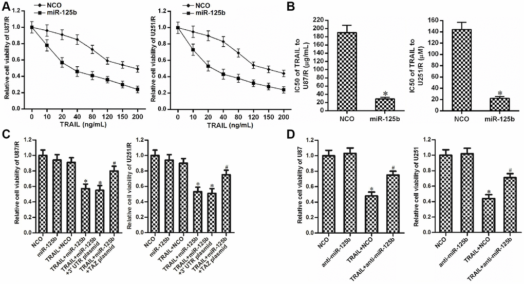As TAZ was the target of miR-125b in glioma, we next explored the effect of miR-125b on changing the drug sensitivity of U87/R and U251/R. We observed that overexpression of miR-125b reduced the drug resistance of U87/R and U251/R cells to TRAIL (Figure 4A). We showed that the IC50 of TRAIL to miR-125b-transfected U87/R cells decreased by 77.5% compared to the NCO-transfected U87/R cells. Meanwhile, IC50 of TRAIL to miR-125b-transfected U251/R decreased by 72.1% compared to the NCO-transfected U251/R cells (Figure 4B). These results showed the sensitization of miR-125b on TRAIL-induced cytotoxicity against U87/R and U251/R. However, we found that transfection with TAZ plasmid abolished the effect of miR-125b on reducing the TRAIL resistance of U87/R and U251/R (Figure 4C). Taken together, these results demonstrated that recovery of miR-125b expression can reduce the TRAIL resistance in TRAIL-resistant glioma cells through suppression of TAZ. In addition, despite TRAIL at the concentration of 10 ng/mL induced significant cytotoxicity against routine U87 and U251 cells, knockdown of miR-125b induced significant drug resistance to TRAIL (Figure 4D). These data emphasized that restore of miR-125b expression can reduce the TRAIL resistance in glioma through suppression of TAZ.